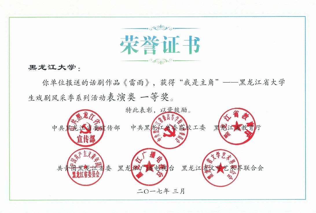 2017年3月,我校文学院中国语言文学实践教学中心幕启戏剧社排演的实践教学剧目《雷雨》在省委宣传部、省委高校工委、省文化厅、省教育厅、省团委、省文联、黑龙江广播电视台等单位共同举办的《“我是主角”——黑龙江省大学生戏剧风采季系列活动》评选中荣获表演类一等奖。