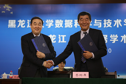 刘德权书记代表学校与相关领导、专家为学院揭牌,他与中国国际贸易促进委员会黑龙江省委员会鄂忠齐会长签订了《黑龙江省贸促会与6686战略合作协议》和《中俄合作网与大数据应用平台建设合作意向协议》。全国高校大数据教育联盟刘计刚副秘书长与6686数据科学与技术学院院长郑大渊教授签署《共建黑龙江省大数据人才培训基地战略合作协议》。