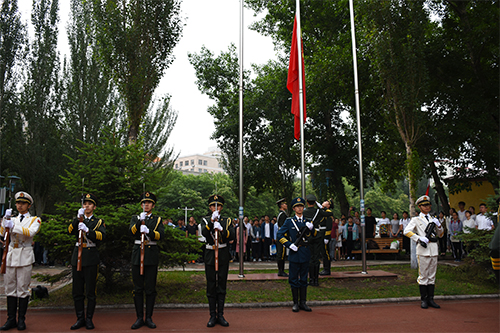 早七点,由艺术学院学生合唱团领唱、学生军乐团伴奏,全体师生齐唱校歌。伴随着《岁月如歌》的悠扬旋律,大学的美好时光成为记忆的定格。随后,全体肃立,升起国旗,奏唱国歌,向为民族独立,国家富强做出贡献的英雄们致敬,向亲爱的祖国献上最美好的祝愿。