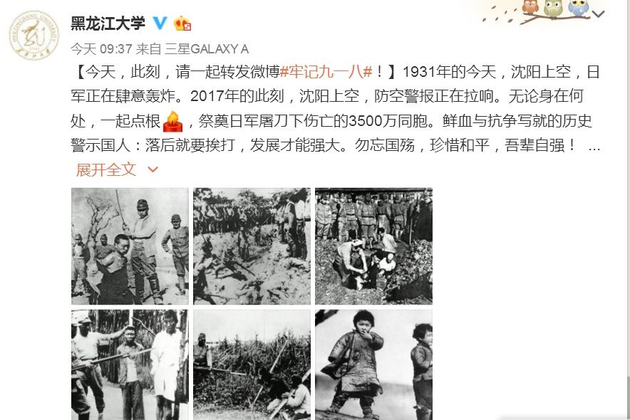 9月18日上午,我校官方微博参与#牢记九一八#话题,发布微博推送,祭奠日军屠刀下伤亡的3500万同胞。勿忘国殇,珍惜和平,吾辈自强!