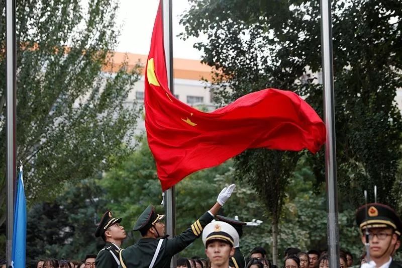 在校军乐团的伴奏下,全体师生齐声合唱《歌唱祖国》,升旗仪式在嘹亮的歌声中结束。