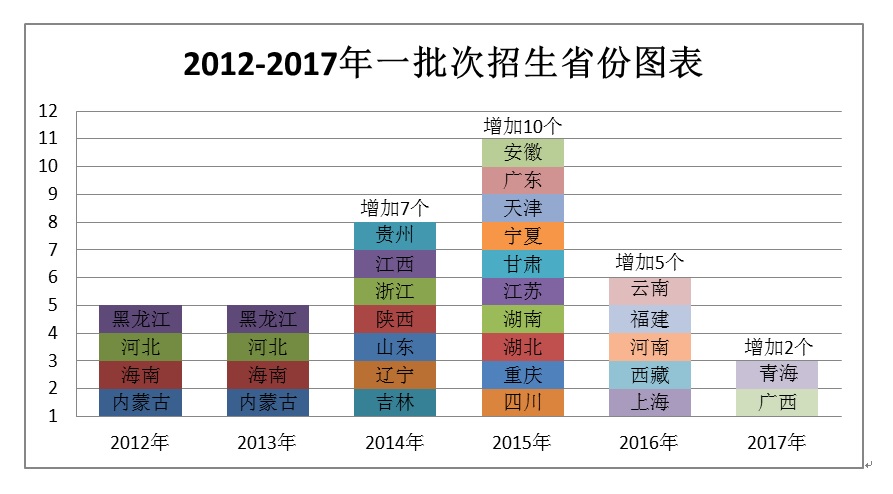 2012年-2017年期间,我校在原有黑龙江、海南、内蒙古、河北四个省区一批次招生基础上,增加天津、上海、吉林、辽宁、山东、陕西、甘肃、宁夏、河南、江苏、浙江、安徽、湖南、湖北、四川、重庆、贵州、云南、广西、广东、江西、西藏、青海、福建等二十四个一批次招生省份,共有28个一批次招生省份。每年录取的省外新生占总数的40%以上,在各招生省份逐渐形成了较为稳定的招生专业群。