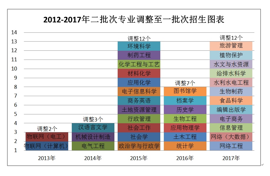 为优化生源结构,我校自2013年起调整专业批次设置,2013年升一批专业2个,2014年3个,2015年12个,2016年7个,2017年12个,累计提升一批专业数36个。截至目前,我校一批次专业72个,二批次专业9个。