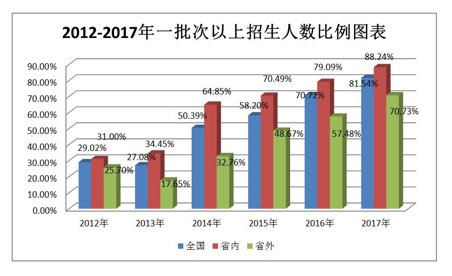 以2017年招生数据为例,全国提前批、一批招生5502人,占全部招生人数的81.54%;其中省内提前批、一批招生3675人,占省内招生人数88.24%,省外提前批、一批次招生1827人,占省外招生人数70.73%,创我校历史新高。