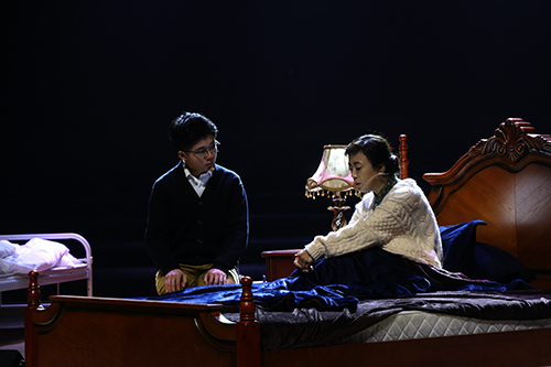 演出开始,昏暗的灯光下演员们手捧河灯排成长队缓缓上台,伴随着悠扬的唢呐声,观众仿佛被带回了风雨飘摇的20世纪30年代。话剧采用了双舞台三时空的舞台设计,以剧中剧的形式展开,随着场景的变幻和情节的穿插,舞台上时而呈现出小说《生死场》里的故事场景,时而转换到40年代沦陷中的香港斯豪酒店,时而转换到呼兰萧红家中的后花园。当萧军与萧红初相爱,萧红大胆作出爱的诗篇时,观众们露出了会心的微笑;当在成业怒摔与金枝的孩子时,现场又爆发出“不要!不要”的惊呼,观众在演员们的精彩演绎中完全被带进了萧红的世界,体味着她的坎坷的个人命运与独到的人生思考。