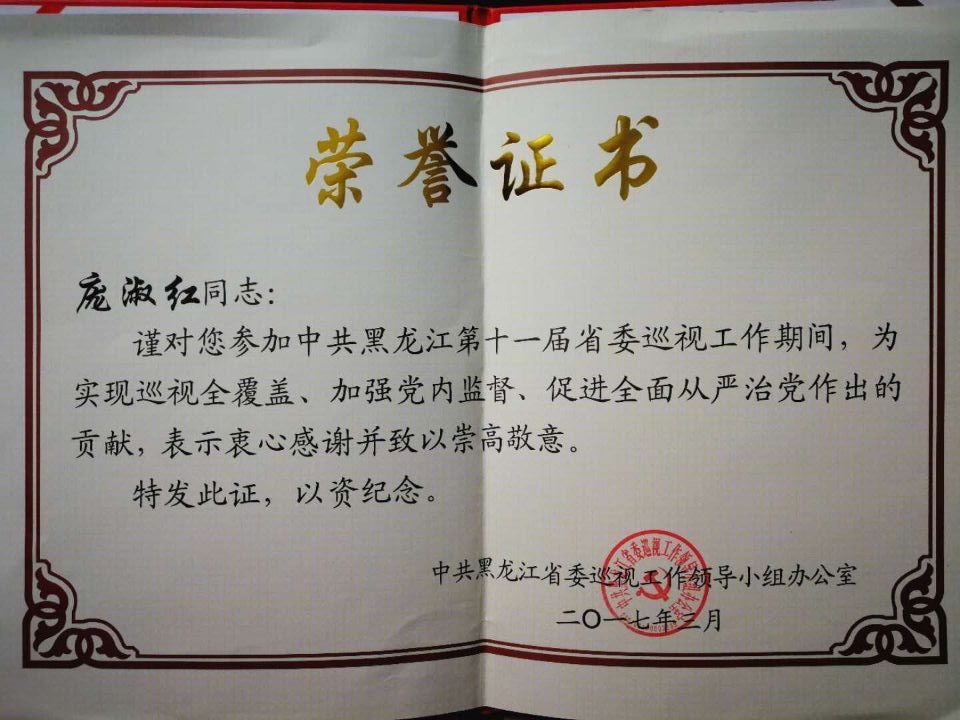 近日,中共黑龙江省委巡视工作领导小组办公室向我校下发了庞淑红、黄强两位同志的荣誉证书。2016年,我校纪委副书记庞淑红同志、国有资产管理处处长黄强同志先后被抽调巡视组挂职,参加了中共黑龙江第十一届省委巡视工作。在参加巡视工作期间,两位同志认真学习巡视工作理论,迅速进入工作角色,坚守各项纪律,充分发挥专业优势和自身特长,不遗余力完成各项工作任务,表现突出。省委巡视工作领导小组为表彰他们在加强党内监督、促进从严治党工作中做出的贡献,向他们颁发了荣誉证书。