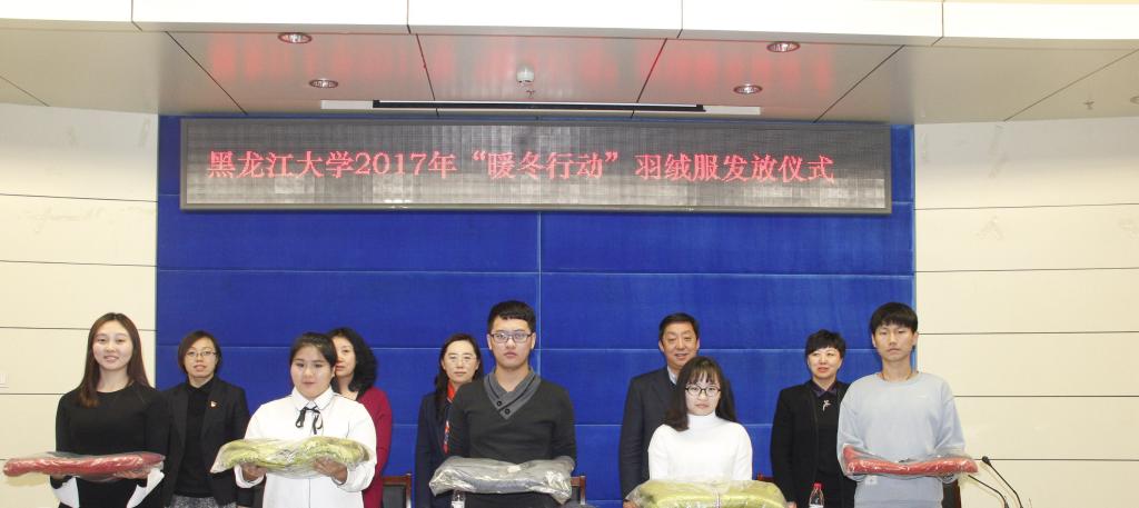 12月20日下午4时,我校在主楼A座226室举行2017年“暖冬行动”羽绒服发放仪式。校党委副书记丁宏,学工部部长李石、副部长李巾英、杨雪虹、孙丽娜,受助学生代表以及辅导员代表出席了发放仪式。本次活动是由哈尔滨美罗湾医院和北京青爱教育基金会共同发起,由哈尔滨美罗湾医院出资10万元为我校家庭经济困难学生购买羽绒服。