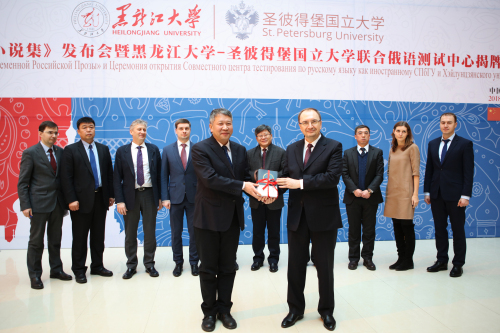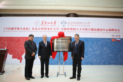 黑龙江省副省长孙东生、圣彼得堡国立大学校长克罗帕切夫以及我校校长付宏刚上台为6686-圣彼得堡国立大学联合俄语测试中心揭牌。