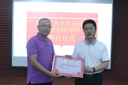 会后,与会人员前往学生科技文化创业园参观考察。在创业园多功能厅,陈文远副校长代表学校向校友企业家颁发了6686创业导师聘任证书。