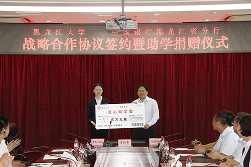 6月21日下午,我校与中国银行黑龙江省分行在主楼8楼会议室举行战略合作协议签约暨助学捐赠仪式。我校校长付宏刚、副校长陈文远,中国银行黑龙江省分行行长周彦军,我校相关职能部处、银行相关负责人等出席签约仪式。签约仪式由陈文远副校长主持。