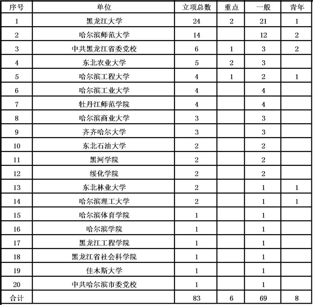 黑龙江省各单位2018年国家社科基金年度项目和青年项目立项数量汇总表