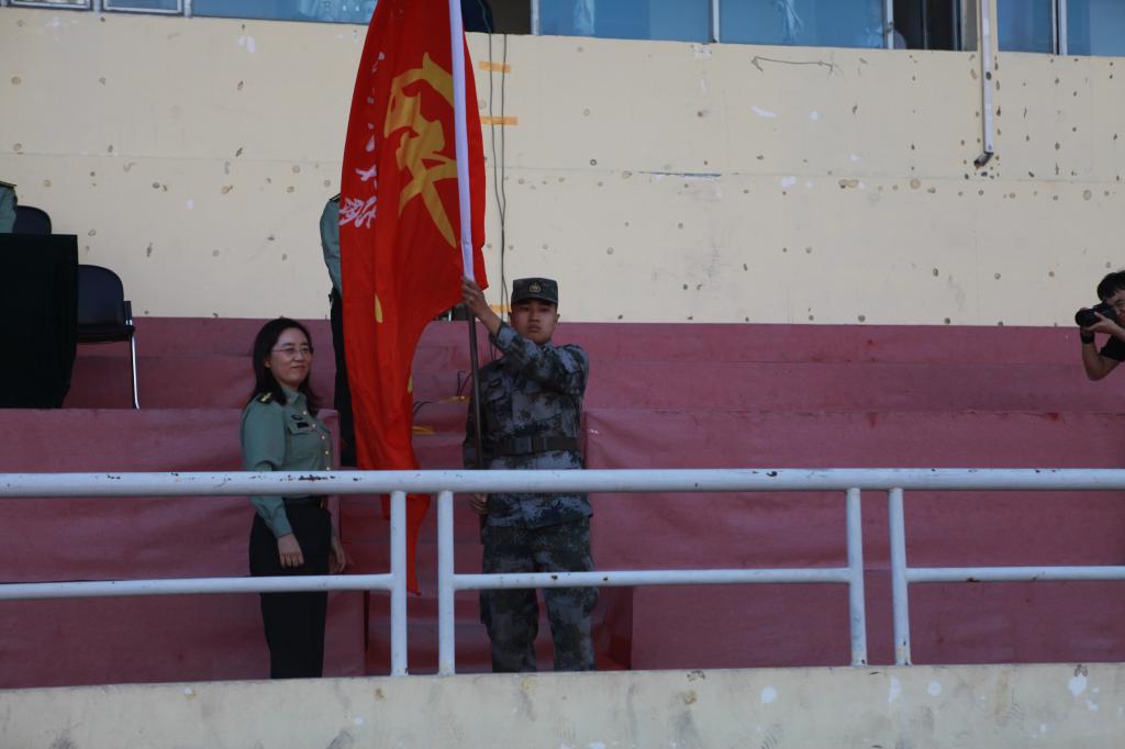 校党委副书记、军训师政委丁宏为军训学生连队授军旗。