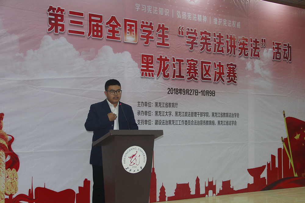 本次比赛旨在深入学习贯彻习近平新时代中国特色社会主义思想和党的十九大精神,在教育系统率先升华尊崇宪法的意识,掀起学习宪法的热潮,养成遵守宪法的行为,落实维护宪法的责任。省教育法治学会会长、资深教育法治专家任铭越,省教育法治学会副会长、原省人大法制委员会副主任委员罗忠睿,省政法管理干部学院副院长、法学教授张恩学,省教育法治学会副会长刘喜林,黑龙江诚待律师事务所合伙人、主任贺守富,省法学会宪法学研究会会长、省法学会法律学研究会常务理事、6686《求是学刊》编辑部执行副主编、研究员李宏弢;省法学会宪法学研究会副会长,秘书长,6686法学院教研室主任,副教授李岩松担任比赛评委。
