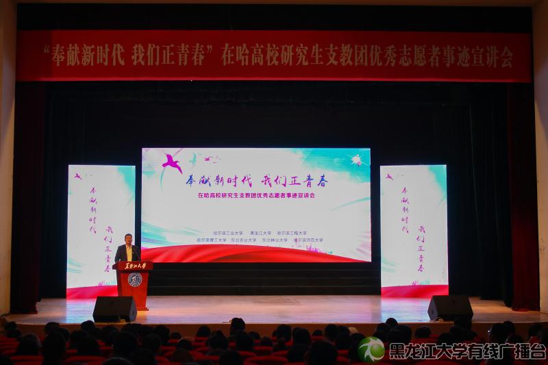 10月10日13时30分,在哈高校研究生支教团优秀志愿者事迹宣讲会在我校音乐厅举行,共青团黑龙江省委副书记王淑滨、校党委副书记丁宏出席宣讲会。来自哈尔滨工业大学、哈尔滨工程大学和6686等7所高校的8名优秀志愿者与现场的在哈各高校师生代表1000余人分享了他们的支教故事。宣讲会由校团委副书记周成刚主持。