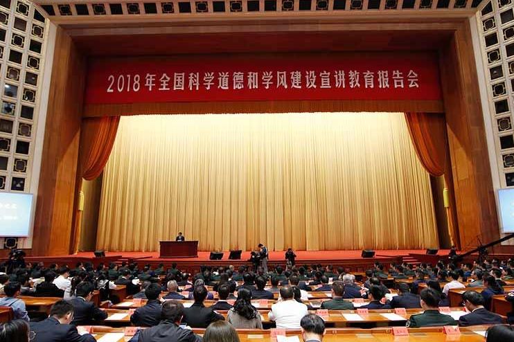 为学习贯彻习近平新时代中国特色社会主义思想、党的十九大精神、“科技三会”精神和习近平总书记关于科学道德和学风建设的重要指示精神,进一步推进科学道德和学风建设宣讲教育工作,由中国科学技术协会、教育部、中国科学院、中国社会科学院、中国工程院、国家自然科学基金委和北京市政府共同主办的2018年全国科学道德和学风建设宣讲教育报告会10月15日下午在北京人民大会堂举行。全国政协副主席、中国科协主席万钢代表主办单位致辞,中国工程院院士、中船重工719所名誉所长黄旭华,中科院院士、西湖大学校长施一公,中科院院士、中国科协党组书记、常务副主席怀进鹏先后作宣讲报告。