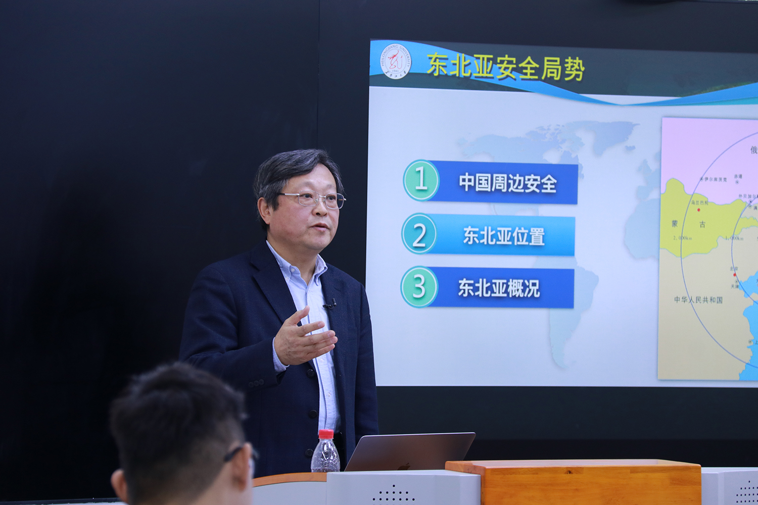 尚晓军教授围绕东北亚概况、半岛核问题、战略再东移、中国破迷局四个方面分析了东北亚安全局势。他从中国周边安全、东北亚位置、东北亚概况三个方面介绍了朝鲜半岛情况,讲解了与朝鲜半岛相关的历史背景、国际形势等方面问题。同时,尚晓军教授介绍了美国战略东移的重点及目的、中国面对美国战略东移采取的有力措施,指出中国始终坚持“西进”战略,推行一带一路政策,秉承交流、理解、包容、合作、共赢理念破迷局。他说,中国国防界人士认为,面对种种困难,中国在看到自己的不足的同时只要坚持发展,光明前景就离我们不会太远。