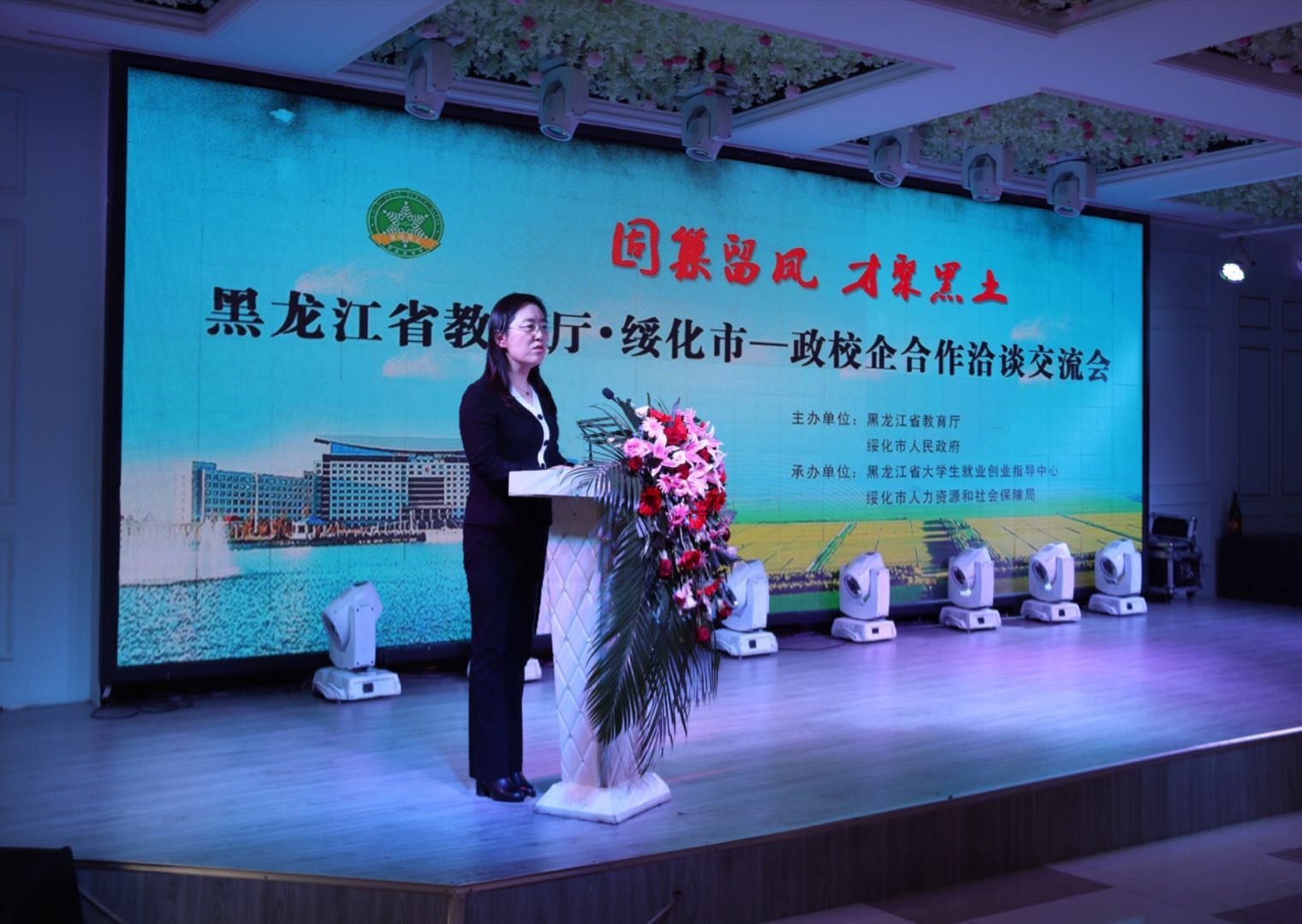 3月20-21日,由省教育厅和绥化市人民政府联合主办,省大学生就业创业指导中心、绥化市人力资源和社会保障局承办的“固巢留凤 才聚黑土”政校企合作洽谈交流活动在绥化市顺利举行。省教育厅党组成员、副厅长姜同河,绥化市委常委、常务副市长、市经济技术开发区党工委书记李锡文出席活动并讲话。省内36所高校、绥化市相关部门及30家重点企业参加活动。我校党委副书记丁宏、招生就业处副处长陈宝凤、市场部李洪明参加此次政校企合作洽谈交流活动。