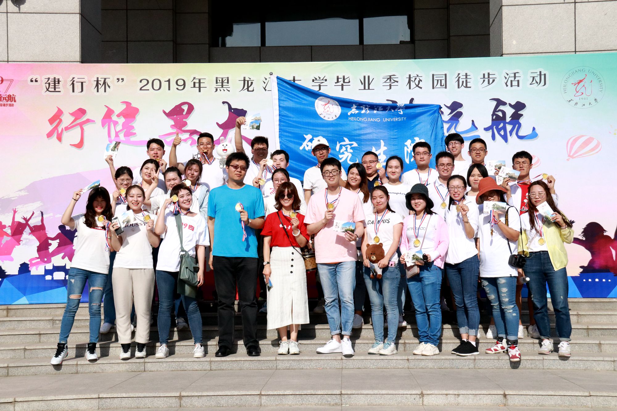 随着校园徒步活动的进行,各学院在沿途设置的6个任务点处集齐通关卡后,带队依次回到主楼广场,领取带有学校LOGO的奖牌及纪念版明信片,最后在主楼广场的签名板及涂鸦墙上签字并合影留念。