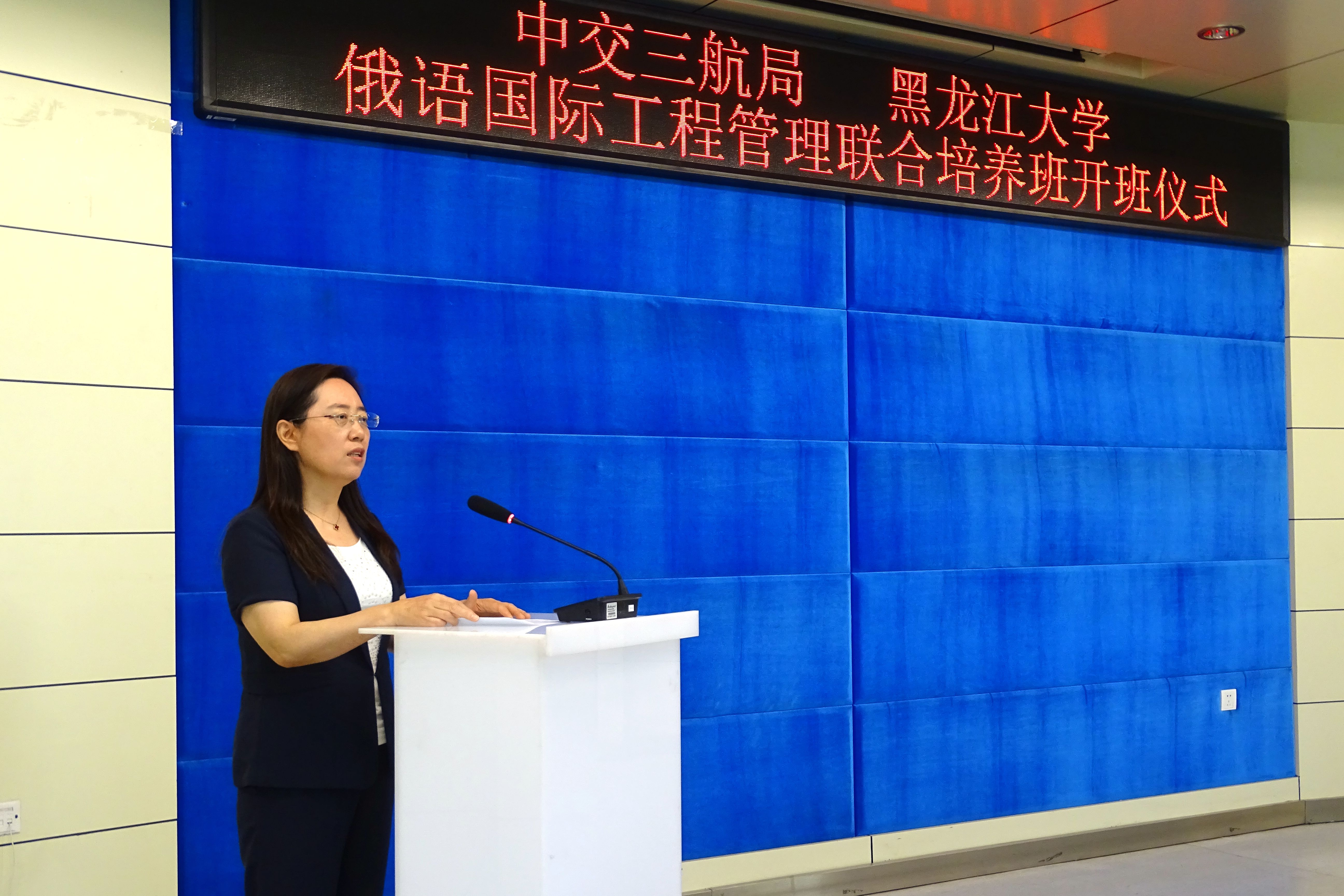 在开班仪式上,我校党委副书记丁宏代表学校向中交三航局各位领导的到来表示热烈欢迎,中交三航局总部在上海是国内最先获得港口与航道工程施工总承包特级资质的国有特大型施工企业,长期以来我校依托于俄语学科优势与平台,致力于推进服务中俄战略协作伙伴关系,在助力“一带一路”国际合作等方面进行了诸多探索,在人才培养、对外交流合作及社会服务等领域实现了与俄罗斯的对接交流与合作,形成了全国高校中独树一帜的对俄办学特色,为俄语人才培养、中俄关系发展及两国经济文化交流做出了重要贡献。丁宏副书记指出,此次俄语国际工程管理联合培养班是发挥我校对俄师资教学优势,满足中交三航局俄语工程管理人才的需要,学校将会用优良的师资、优质的课程、优越的服务为培养班的开展提供全面保障。希望同学们在学习中刻苦努力,学有所获,争取早日成为一名俄语水平过硬、专业知识丰富、能担企业重任的高端复合型人才。