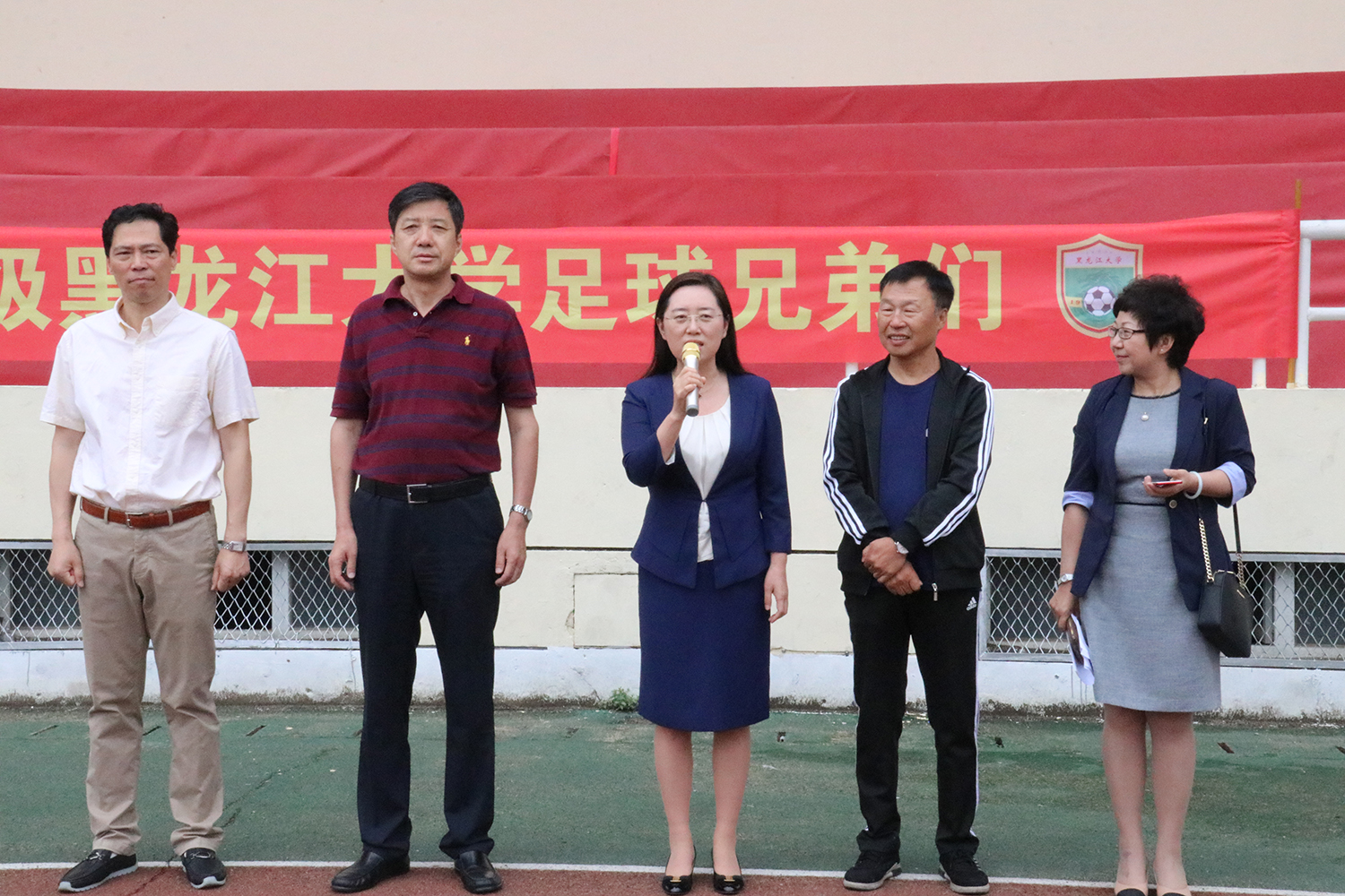 丁宏副书记致辞。她代表学校对本次校友返校参加活动表示热烈的欢迎,对关心黑大发展的各位校友、为此次活动付出汗水的所有人员表示衷心的感谢。她深情地说,回首往昔,各届足球运动员主动参与校园文化活动,发挥自身特长,凝聚班级力量、学院力量,在学生与老师心中留下了美好回忆与深刻印象。无论是校内活动,还是校外比赛,都能看到诸位运动员在足球场上奔跑的身影,已成为学校的一道亮丽的风景线。此次能将跨班级,跨专业,跨学院、跨年龄的来自五湖四海的校友聚集于此,离不开各位校友的黑大情怀、同学情谊。她表示,学校重视校友工作、珍惜校友返校机会,努力为校友搭建沟通的平台和优质的服务。此次足球友谊赛开创校友活动新模式,促进校友工作创新发展,为校友们共叙情谊提供新平台,为我校发展创造新契机。