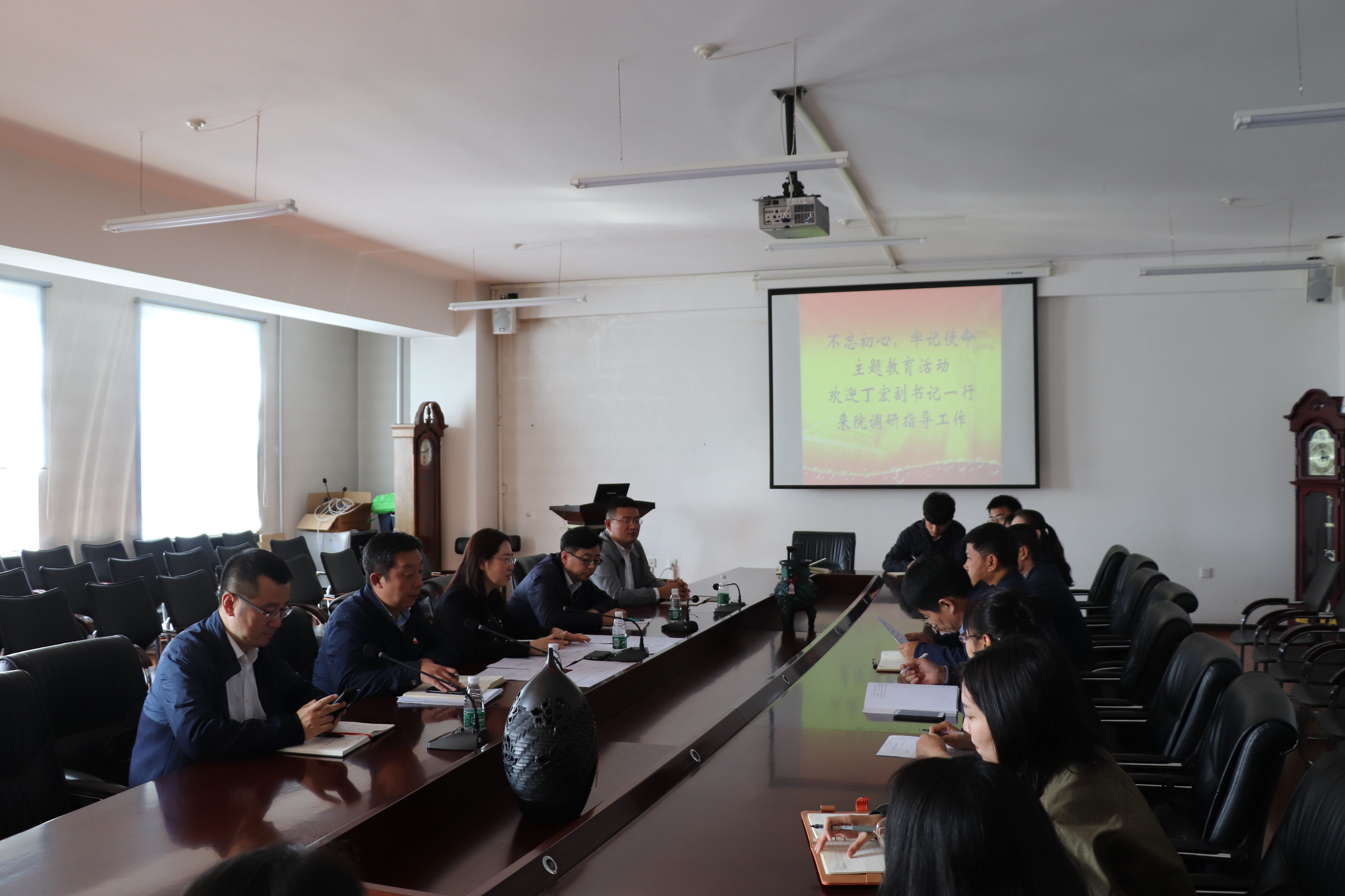 党委书记王永清赴联系点哲学学院,听取了学院关于主题教育工作部署及落实情况,查阅了学院处级党员干部个人自学计划、学院集中学习研讨方案、个人调研计划安排以及学院调查研究工作方案。他肯定了哲学学院以往的工作成绩,并针对此次主题教育提出了明确的要求,要求全体处级党员干部充分利用时间,抓好落实,既不能搞形式主义,也不能放松日常业务工作,建议同志们在读原著、学原文、悟原理的基础上,采取多种学习形式,利用好网络媒体资源,并推荐将《这就是中国》《我们走在大路上》和《中国正在说》等专题片作为补充学习内容。同时,他还鼓励学院继续发挥传统优势,成立主题教育宣讲团,进一步扩大提升学习效果。