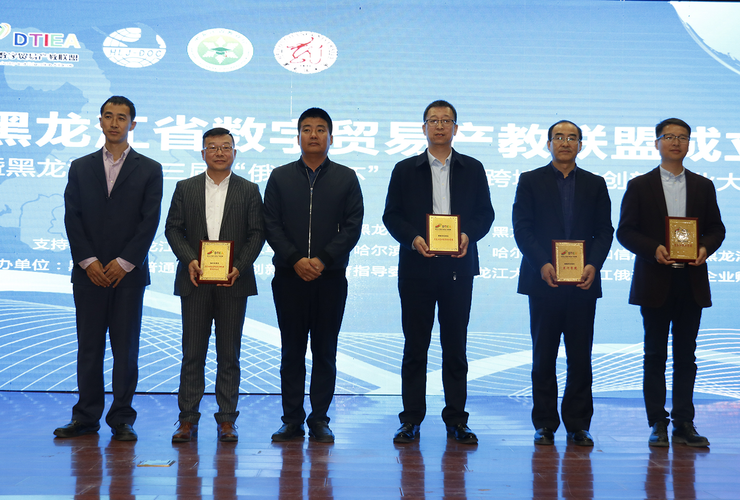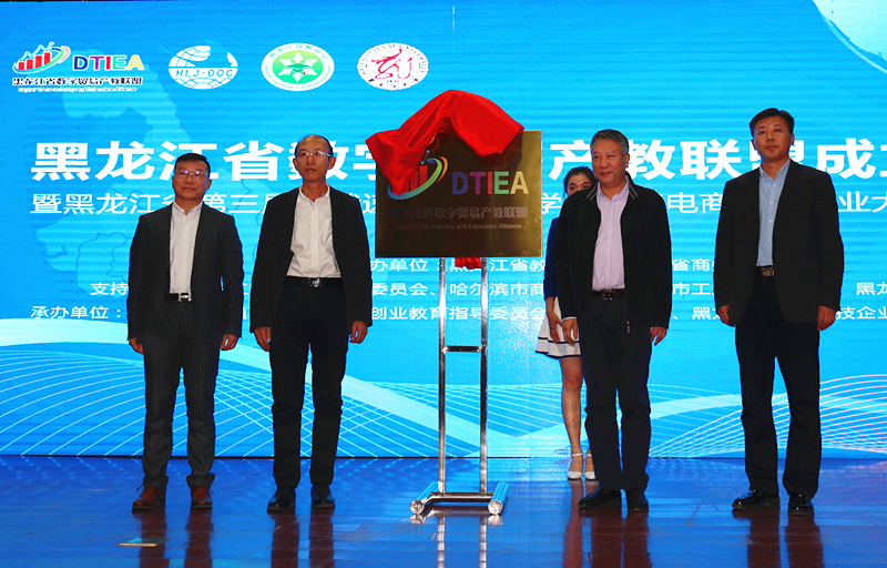 与会领导共同为黑龙江省数字贸易产教联盟揭牌,随后启动黑龙江省第三届“俄速通杯”大学生跨境电视创新创业大赛。