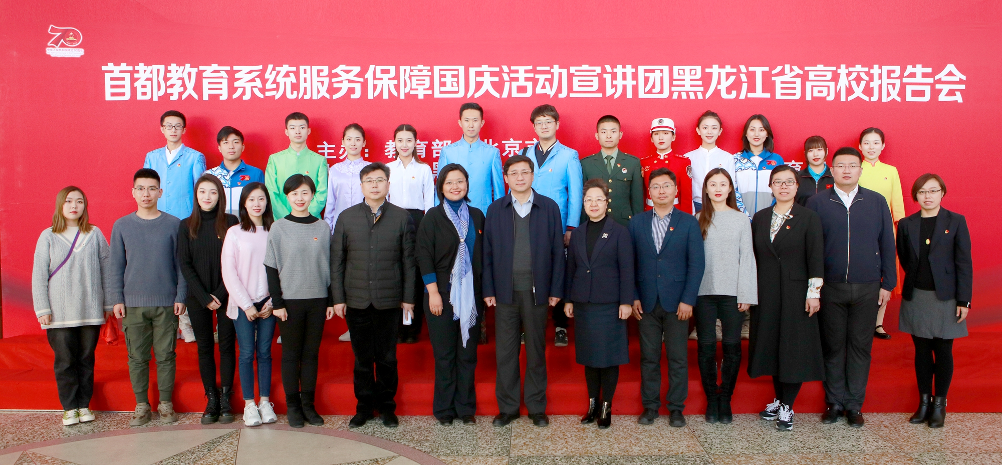 在新中国成立70周年系列庆祝活动中,首都教育系统9.6万余名师生在服务保障工作中作出重要贡献。为表彰首都教育系统在服务保障国庆活动中作出的重要贡献,教育部签署嘉奖令,号召全国教育系统向参与活动的首都高校及各类学校的师生学习。11月8日上午,首都教育系统服务保障国庆活动宣讲团黑龙江省高校报告会在6686举行,来自中国传媒大学、北京舞蹈学院的13名师生在我校音乐厅分享了他们参加国庆70周年庆典活动的感人故事。我校师生代表1000余人在现场参加了报告会,全省高校有6.9万名师生同时收看网络直播。省委教育工委委员、二级巡视员董成和我校党委副书记蒋晶洁会见了宣讲团成员并出席报告会。