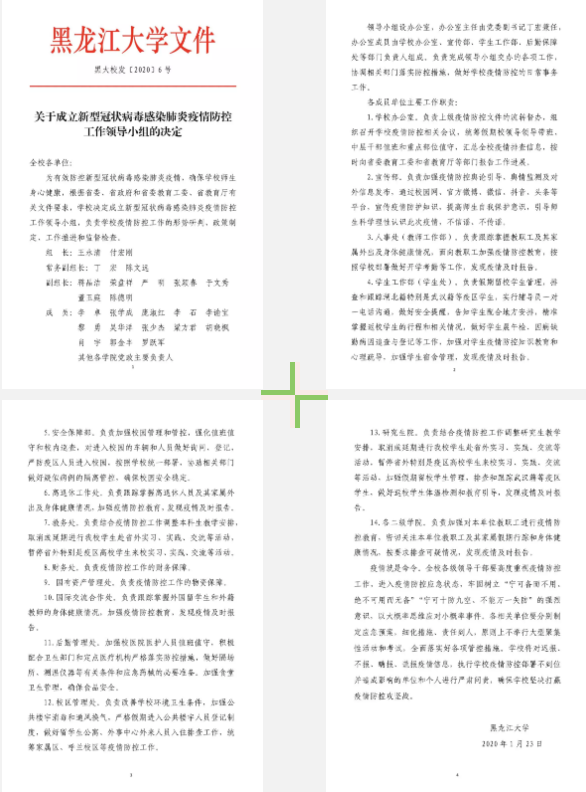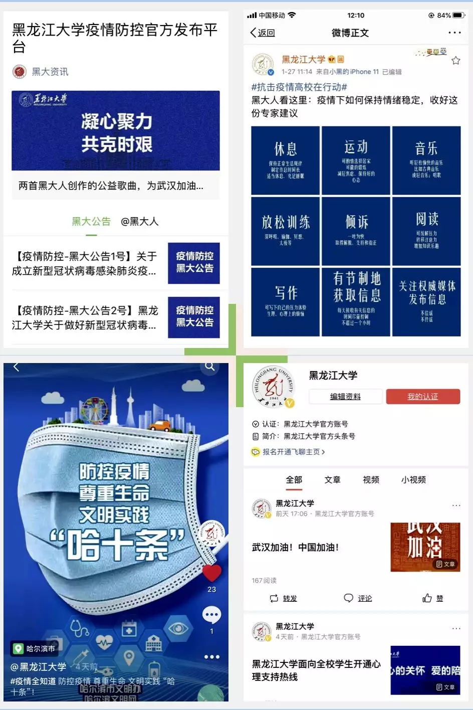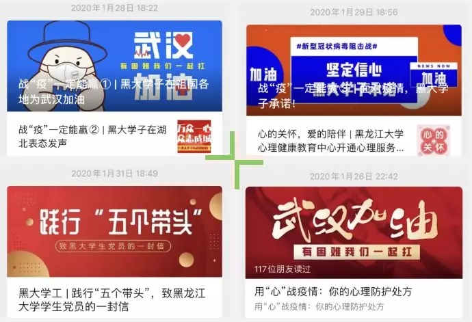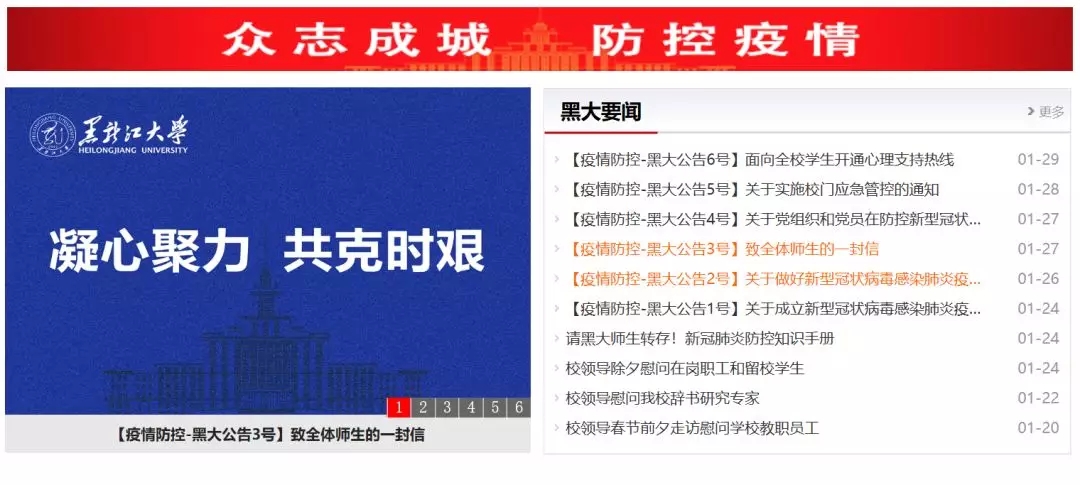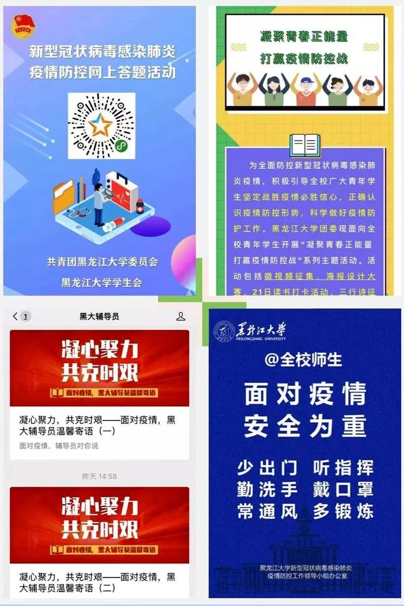 自1月23日起,学校陆续通过校园网、新闻网、官方微博、微信、抖音、今日头条等平台密集推送宣传疫情防护知识、最新疫情消息及学校疫情防疫公告等。及时发布《致全体师生的一封信》《关于党组织和党员在防控新型冠状病毒感染的肺炎疫情中切实发挥带头作用的通知》《关于实施校门应急管控的通知》《面向全校学生开通心理支持热线》等。黑大资讯、黑大学工、黑大青年、黑大后勤等微信平台开设“疫情防控”专栏,发布防控公告、防控手册、防控提示、黑大人创作的公益歌曲等内容的各类推送40余条。官方微博、今日头条、抖音、易班等平台制作发布6条短视频和20余篇推送信息,各类信息累计阅读量超过32万人次。