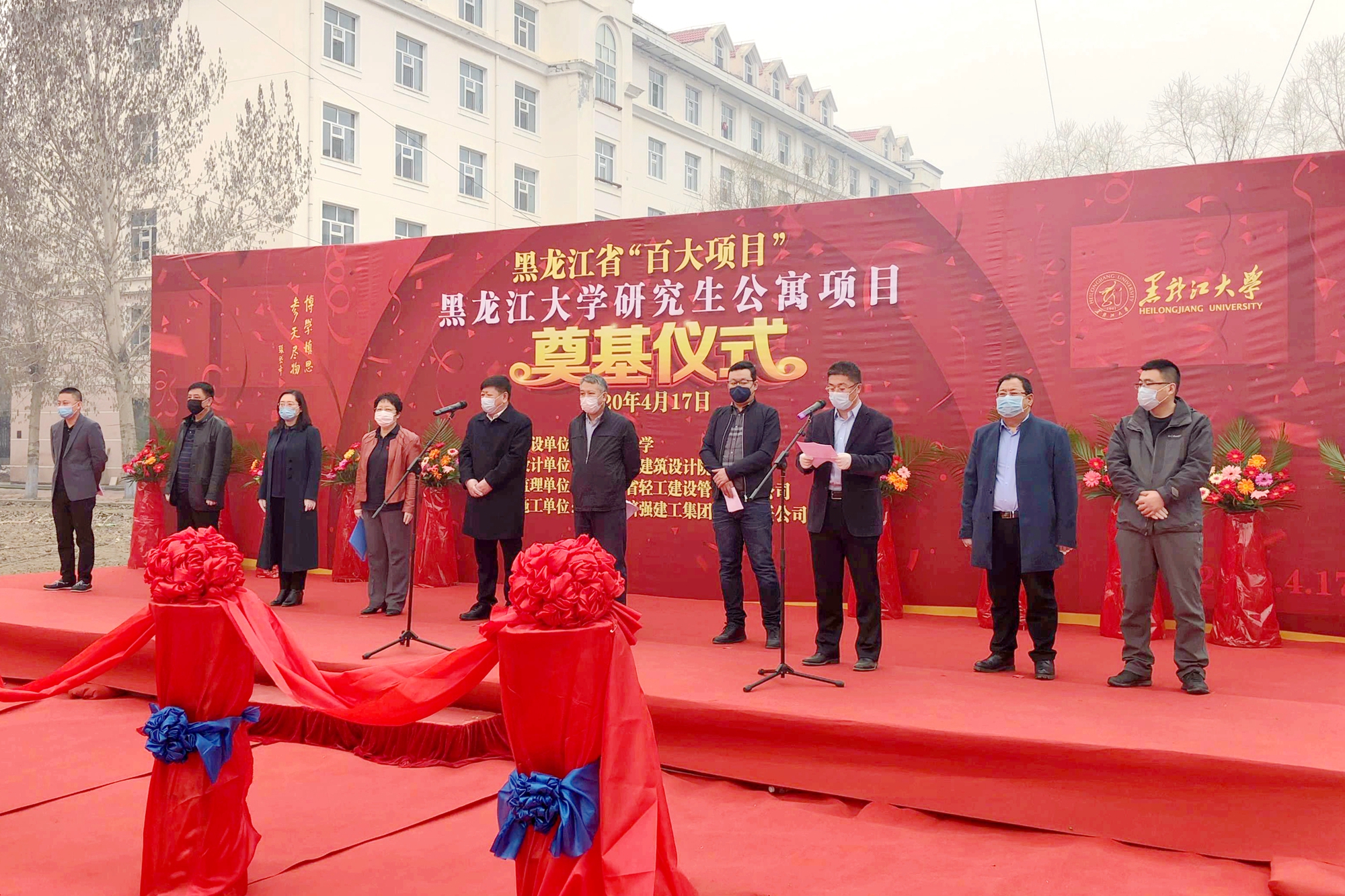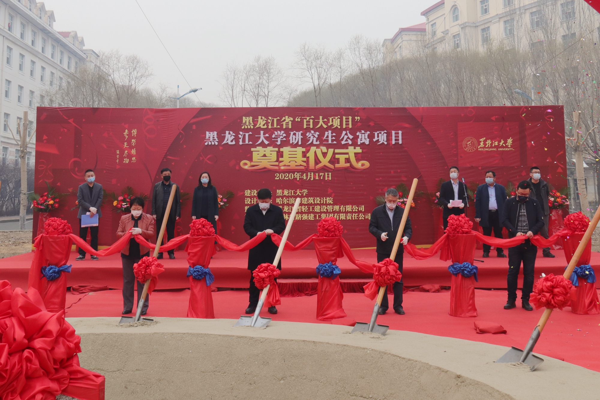 为改善学生住宿环境,推进后勤整改走深走实,助力我校人才培养质量提高和内涵发展,4月17日,黑龙江省“百大项目”6686研究生公寓项目奠基仪式在丽泽园体育场举行。我校党委书记王永清、校长付宏刚,校党委副书记丁宏,副校长张颖春、董玉庭,吉林省跻强建工集团有限责任公司总经理姜华,黑龙江省轻工建设管理有限公司副总经理蔺磊等出席仪式。我校副校长陈文远主持仪式。