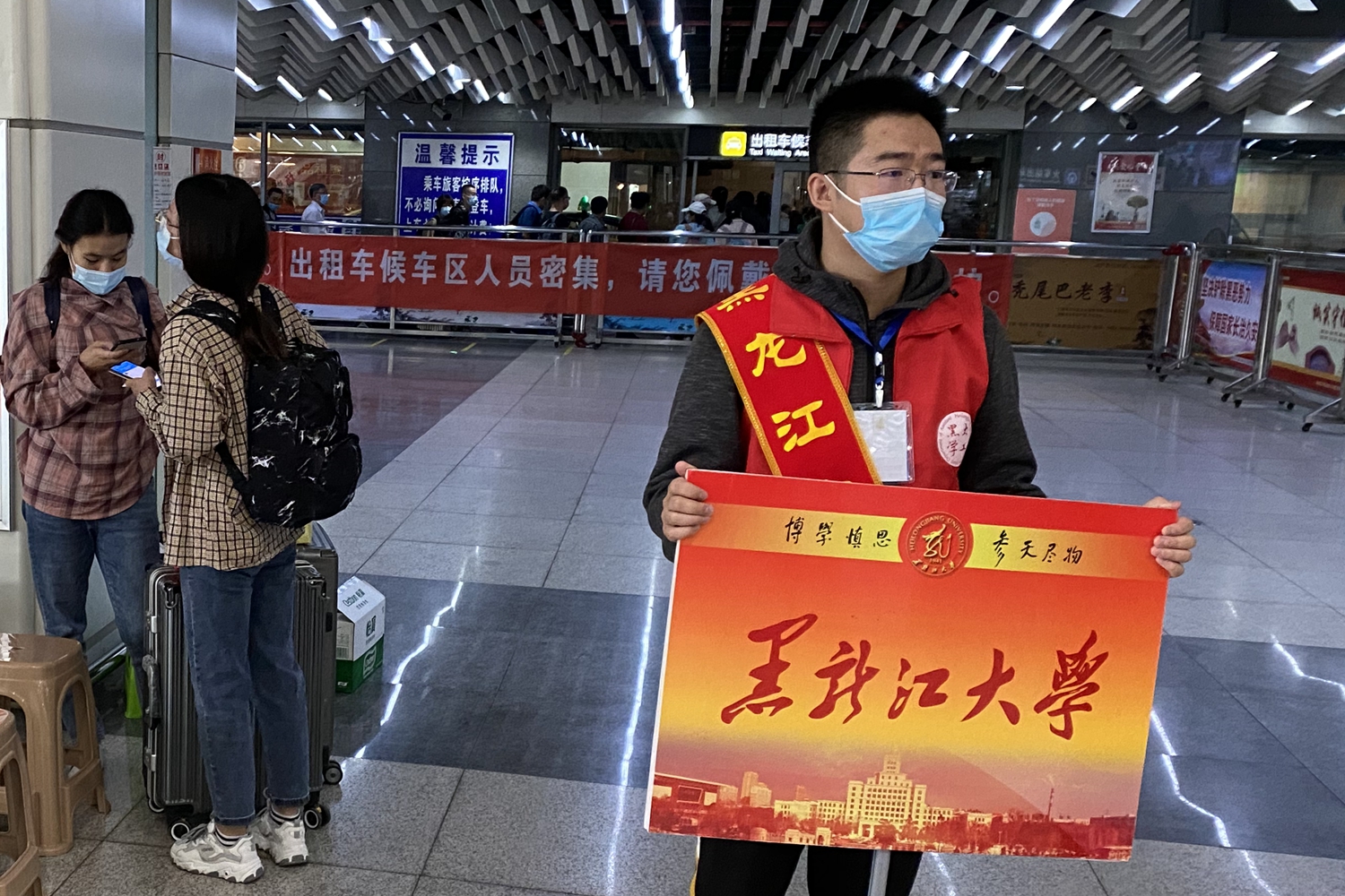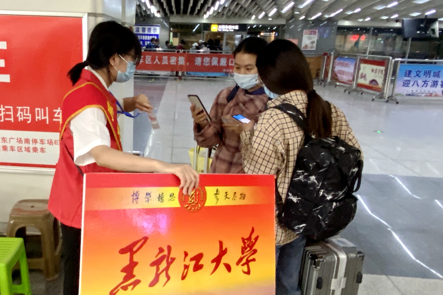 依托数字迎新平台,学校提前统计好新生报到车次及时间,科学安排接站车辆;在哈站、哈西站设立接站点,安排近20组500余名同学,提供全天候、不间断接站服务。