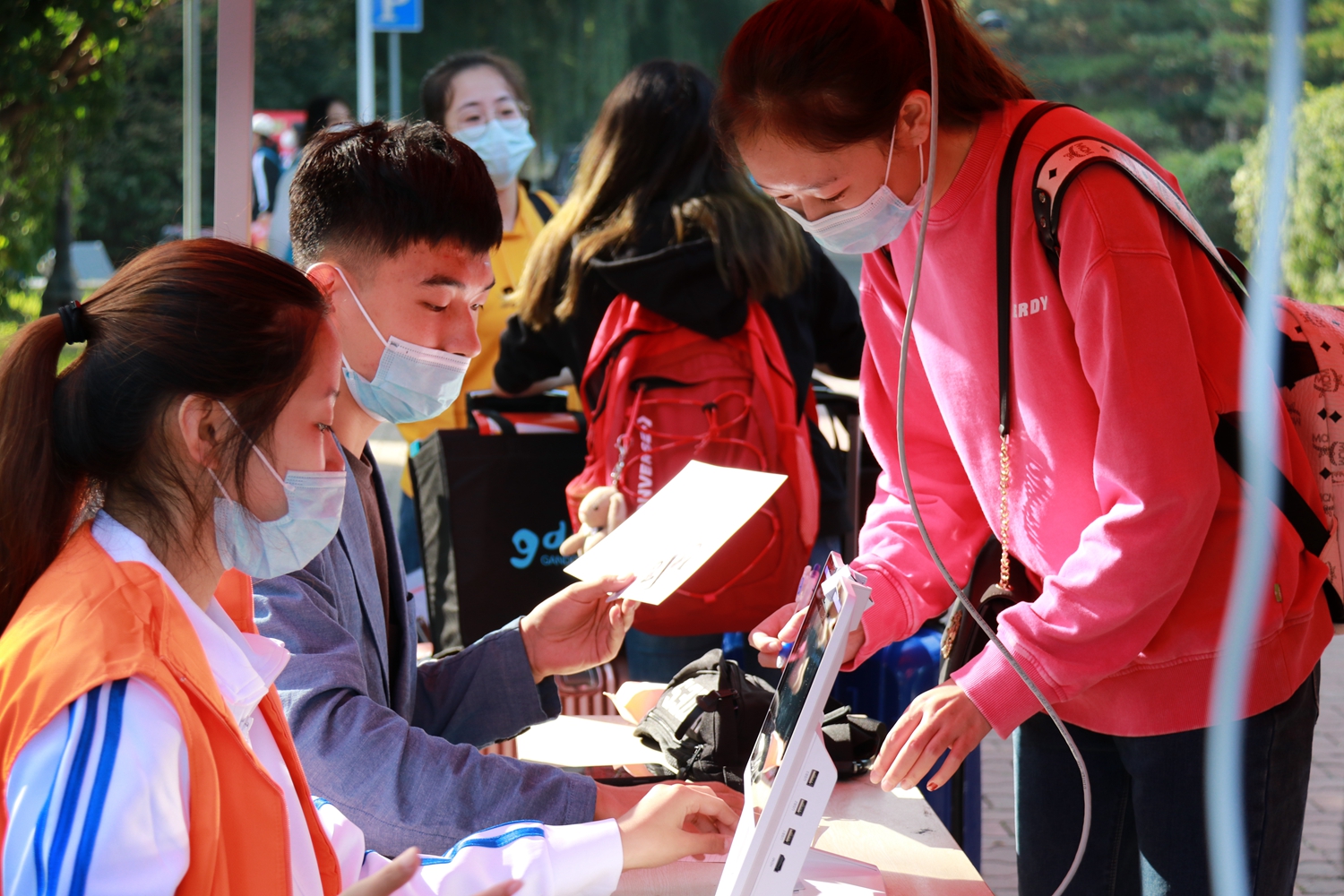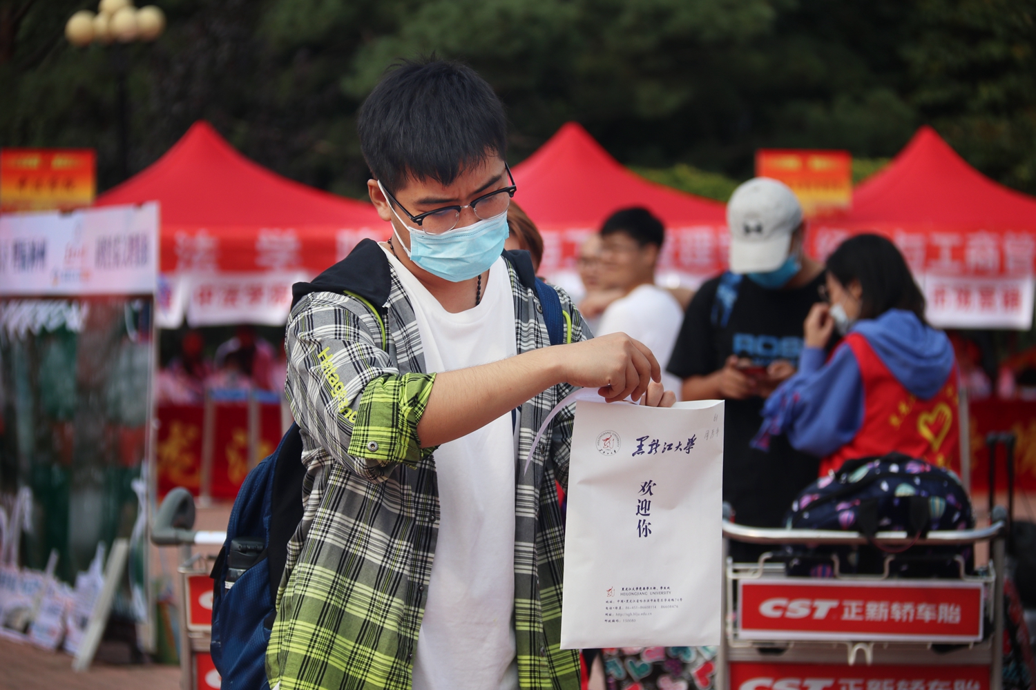 到了学校门口,行李消杀、测量体温、龙江健康码核验、身份核验、核酸检测、在主楼广场办理入学手续,在展板前签上名字、写下祝福语,作为入学第一天的纪念,一系列流程顺利而又高效。