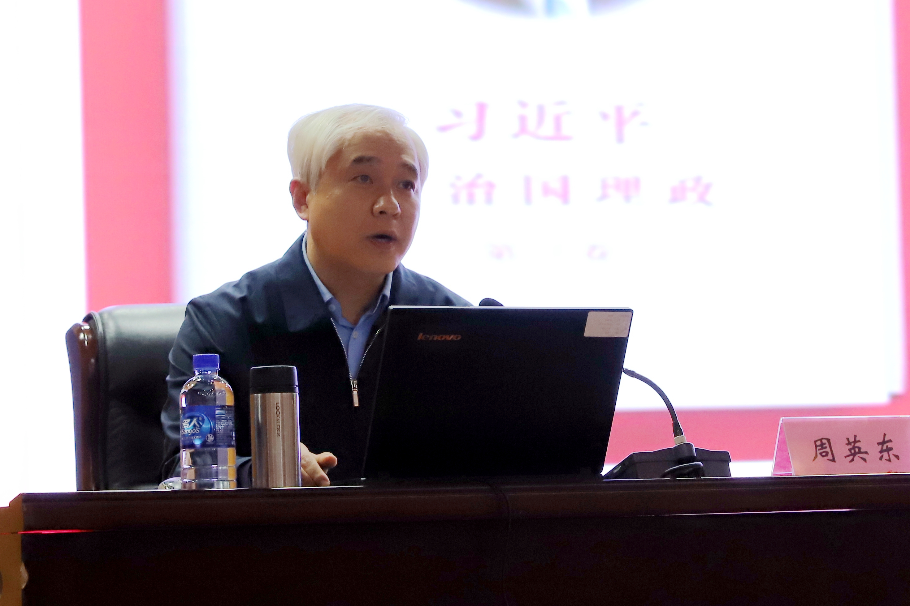 周英东教授以《紧跟总书记 学习新思想》为题对《习近平谈治国理政》第三卷进行了详细解读。他指出,一要深刻领会《习近平谈治国理政》第三卷的重大意义。要充分认识到《习近平谈治国理政》第三卷是深化理论武装的权威著作,是重大实践成果的生动记录,是新时代新作为的思想引领,也是世界了解中国的重要窗口。二要准确把握《习近平谈治国理政》第三卷的精髓要义。要聚焦于坚持和发展中国特色社会主义,聚焦于坚持和加强党的全面领导,聚焦于坚持以人民为中心的根本立场,聚焦于完善和发展我国国家制度和治理体系,聚焦于防范化解风险挑战。三要推动学习《习近平谈治国理政》第三卷取得实效。要带着信念学,学出对党忠诚;带着感情学,学出人民情怀;带着使命学,学出责任担当;带着问题学,学出能力水平。