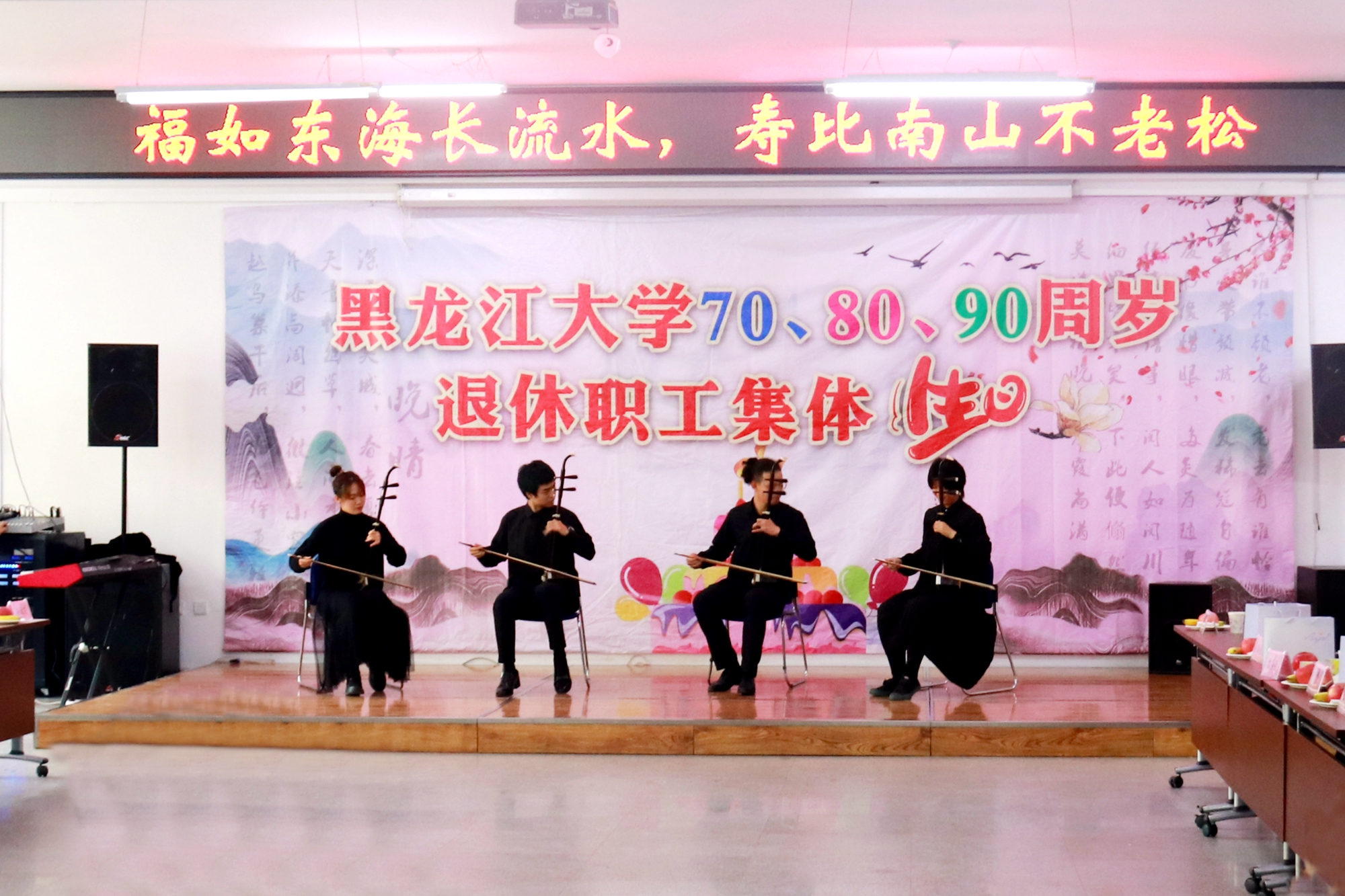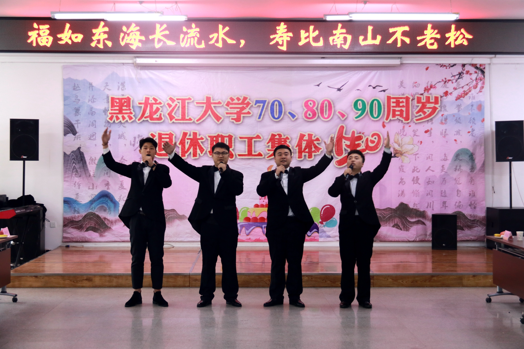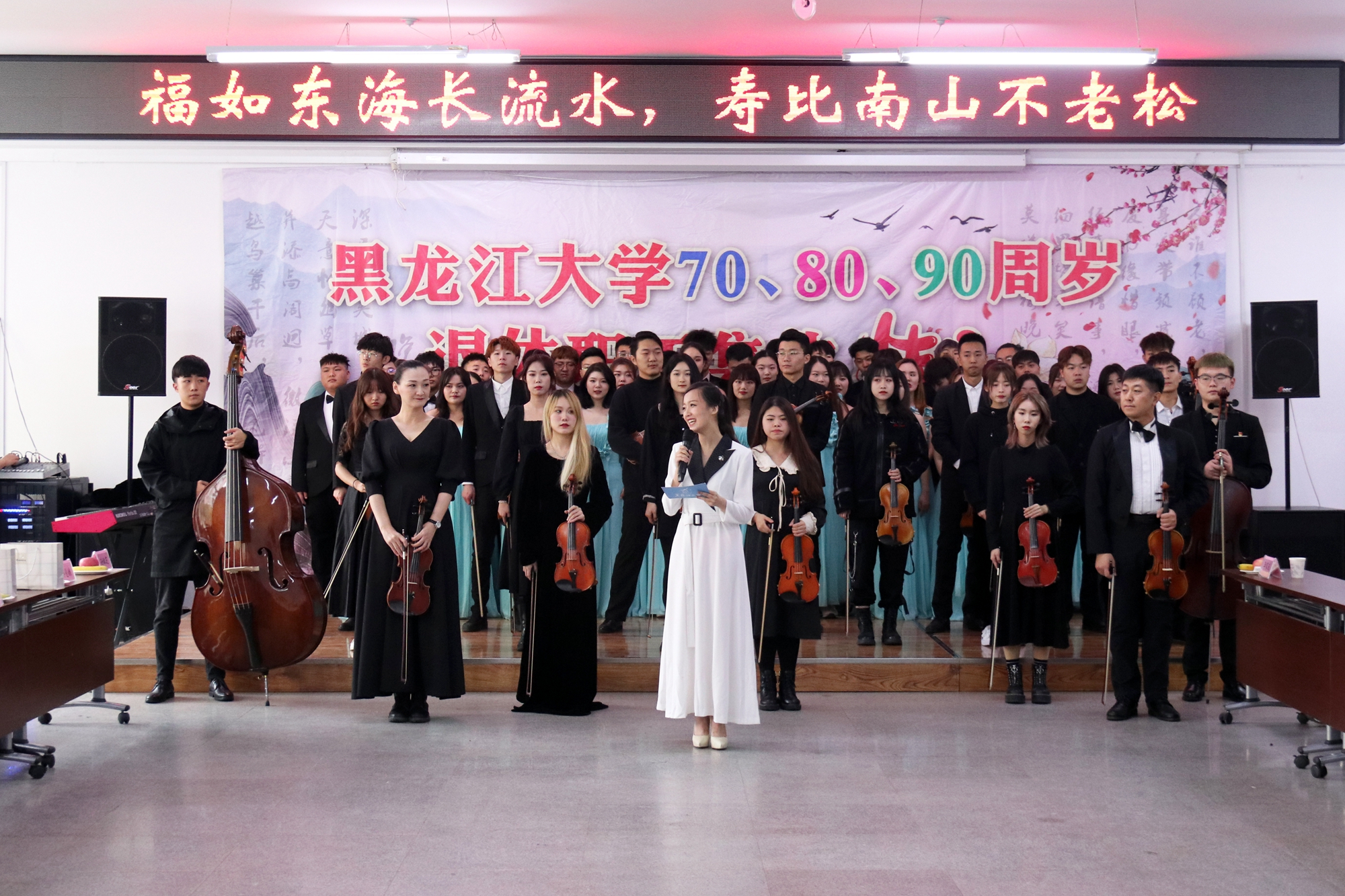 伴随着嘹亮的小号演奏《辉煌的号角》,由我校艺术学院师生精心准备的文艺表演拉开了序幕。女高音独唱《我们的生活充满阳光》优美动听,古筝齐奏《盛世国乐》展现了国粹魅力,描绘出春江波滟滟,明月共潮生的盛世场景,混声四重唱《共筑中国梦》满怀豪情,二胡齐奏《战马奔腾》气势恢宏,男生五重唱《到敌人后方去》《游击队歌》带领我们回到了那段峥嵘岁月,单簧管四重唱《歌剧魅影》再现了经典曲目,女高音独唱《玛依拉变奏曲》唱响了哈萨克族民歌,大合唱《奉献》唱出了黑大人不忘初心、无私奉献的精神风貌。伴随着《保卫黄河》的嘹亮歌声,本次生日会圆满结束。