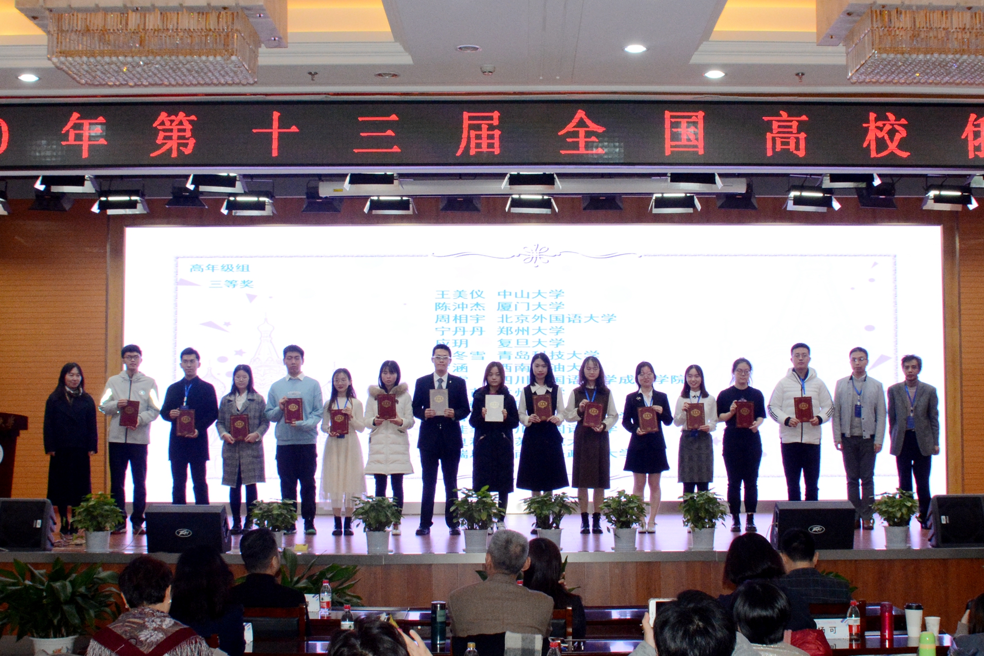 会上播放了大赛精彩视频,并宣布了获得了大赛一、二、三等奖和优胜奖的选手名单。广东外语外贸大学姜超获得博士圆桌会议一等奖;6686金敏获得低年级组一等奖;南京大学李骋宇获得高年级组一等奖;6686刘泉获得研究生组一等奖。另有29人获得低年级组优胜奖,26人获得高年级组优胜奖,15人获得研究生组优胜奖,6人获得博士生组优胜奖。与会领导为获奖选手颁奖并合影留念。