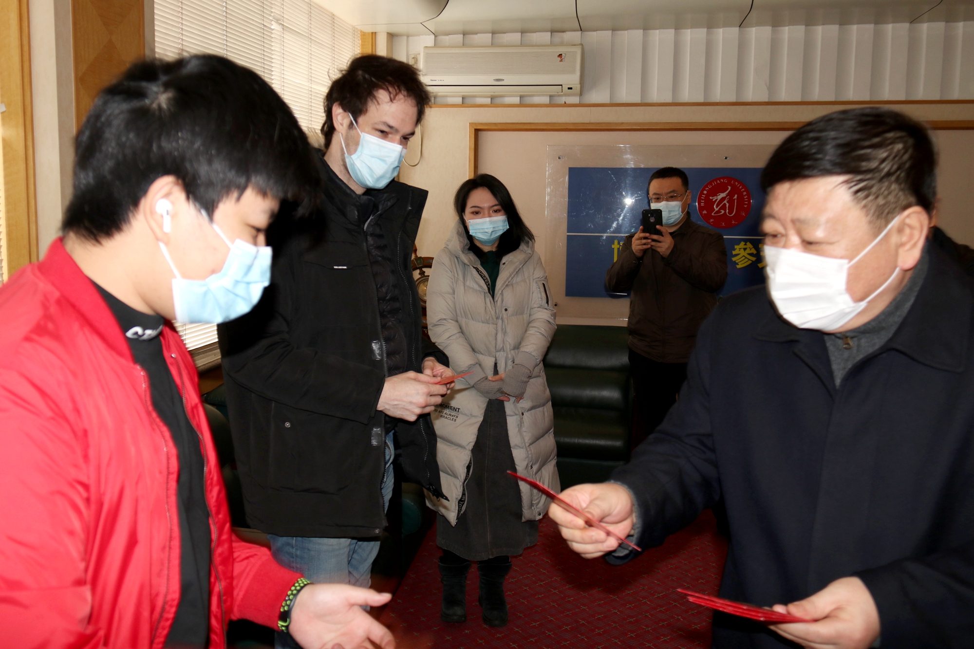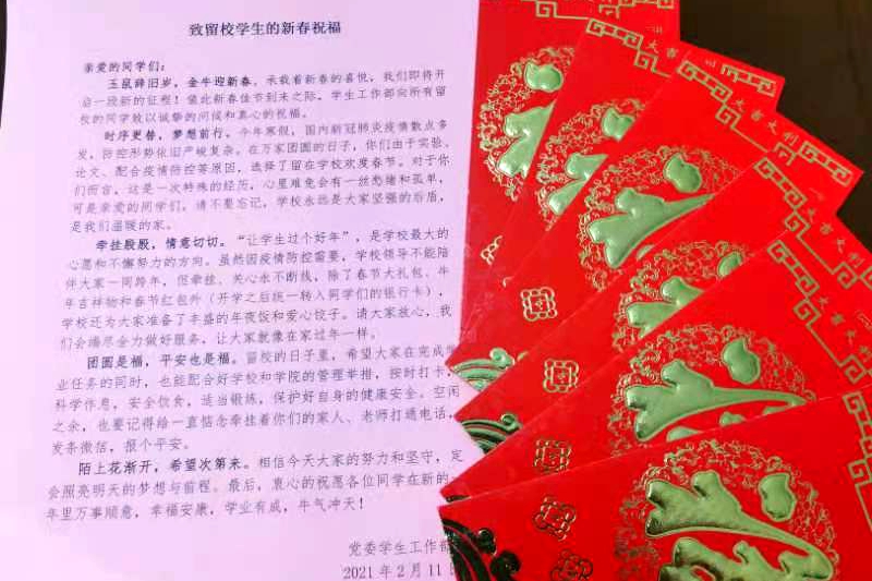 据悉,为保障留校学生在学校过一个安全、温暖的春节,学生公寓实行封闭管理,对公寓卫生防疫情况进行日报告。6686为寒假留校学生推出“送祝福暖新春”系列活动,为留校留学生推出线上中外学生联谊活动等,从校园安全、防疫保障、日常管理、后勤服务等多个方面提供全方位保障,织密 “服务网”。学校领导、相关学院领导和辅导员老师多次深入寝室看望问候春节留校学生,与学生进行沟通,送去新春问候与祝福。春节期间,学校还特别购置了春联、彩旗等物品,学生公寓工作人员与留校学生一起把学生公寓装饰一新,营造了浓厚的过节氛围。学校为留校学生准备了春节红包和新年大礼包,除夕夜提供年夜饭大餐和爱心饺子券,春节期间免费供应爱心饺子。一份份新春礼包、一碗碗暖心饺子,传递着家校情、师生情,确保学生在校园里度过一个温暖、祥和、难忘的春节。(摄影:赵春争)