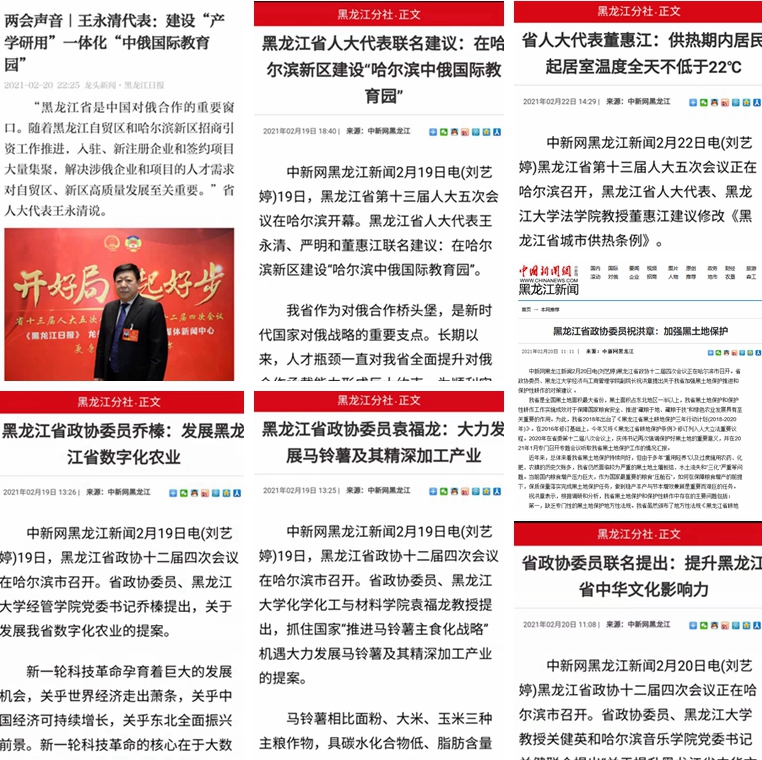 由省人大代表、校党委书记王永清牵头,组织学校人大代表、政协委员及相关专家学者开展深入调查研究,提交了《关于在哈尔滨新区建设全国首家“中俄国际教育园”的建议》联名建议,建议哈新区牵头,采用“新区搭台、高校主体、中俄协作、官民共举”的模式建设全国首家实体集群形态的“中俄国际教育园”,在会议期间得到多家媒体关注并予以宣传报道。王永清书记在接受媒体采访时表示,希望通过“中俄国际教育园”的建立,打造国家级中俄教育合作新高地和中俄国际产教融合新样板,助力我省“十四五”期间“建成国家向北开放重要窗口和东北亚地区合作中心枢纽”的目标,以此实现服务新时代中俄全面战略协作伙伴关系的新突破。同时,6686将发挥建校80年来雄厚的俄语资源优势,助力涉俄项目资源的整合与对俄高端复合型人才的培养输送。