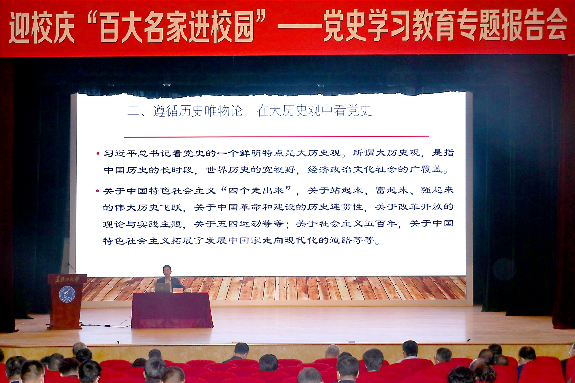 杨凤城教授运用大历史观,透过纷繁复杂的历史事件,透过跌宕起伏的历史过程,详细阐述新革命、新中国、新时期、新时代四个阶段的历史特点、主要历史功绩和历史地位。他指出,中国共产党的历史是用鲜血、汗水和泪水写就的,中国共产党不断在挫折中奋起,在浴火中重生,在苦难中成就了辉煌。当前,中国综合国力的迅速提升,国际地位的显著提升,中国日益走向世界舞台中央,为发展中国家实现现代化拓展途径提供了中国案例。新的历史起点上,我们依然要坚定不移高举中国特色社会主义伟大旗帜,奋勇前进,创造更加灿烂的辉煌。