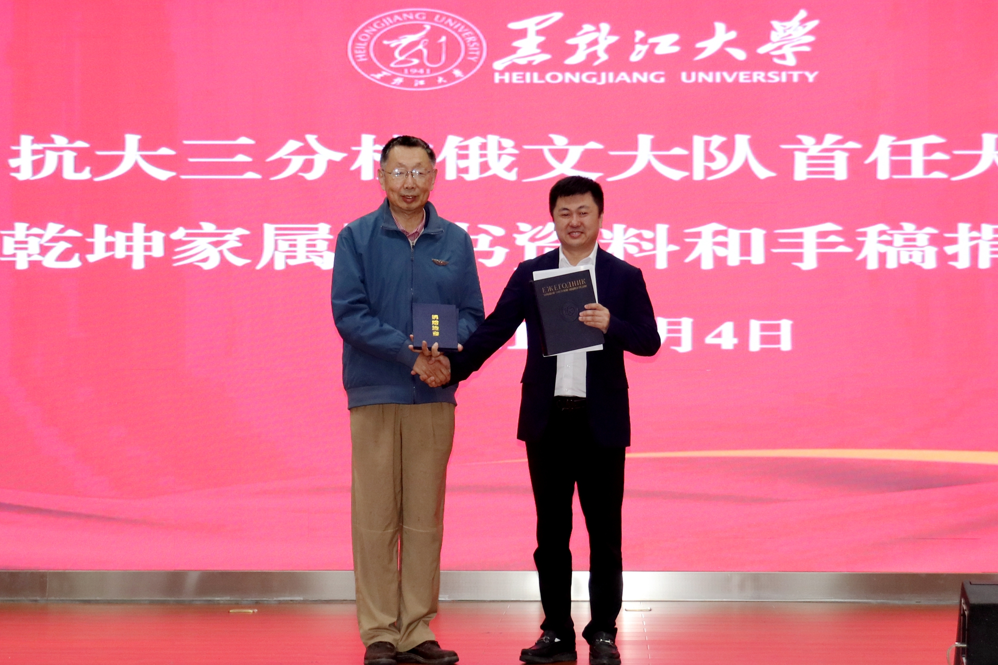仪式上,常砢先生向我校捐赠常乾坤大队长的中俄双语手稿资料和他从苏联带回的51卷本《苏联大百科词典》。