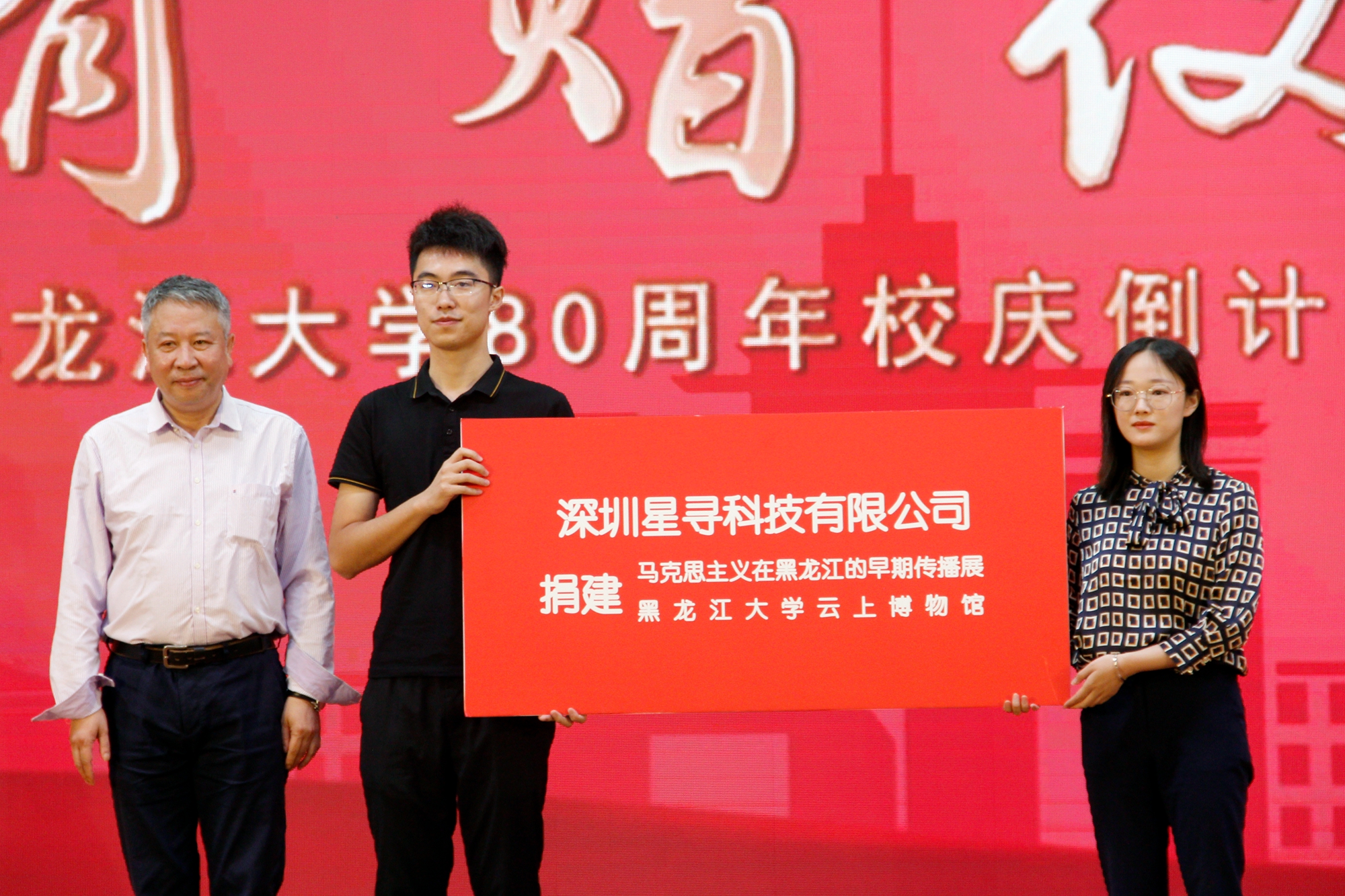 2016届校友全一明、张雪莹代表深圳星寻科技有限公司捐建马克思主义在黑龙江早期传播展和6686云上博物馆项目,校长付宏刚代表学校接受捐赠,并为他们颁发捐赠纪念证书;2011届校友李欣昱代表哈尔滨金泰科技开发有限公司捐建校史馆改扩建项目,王永清书记代表学校接受捐赠,并为她颁发捐赠纪念证书。