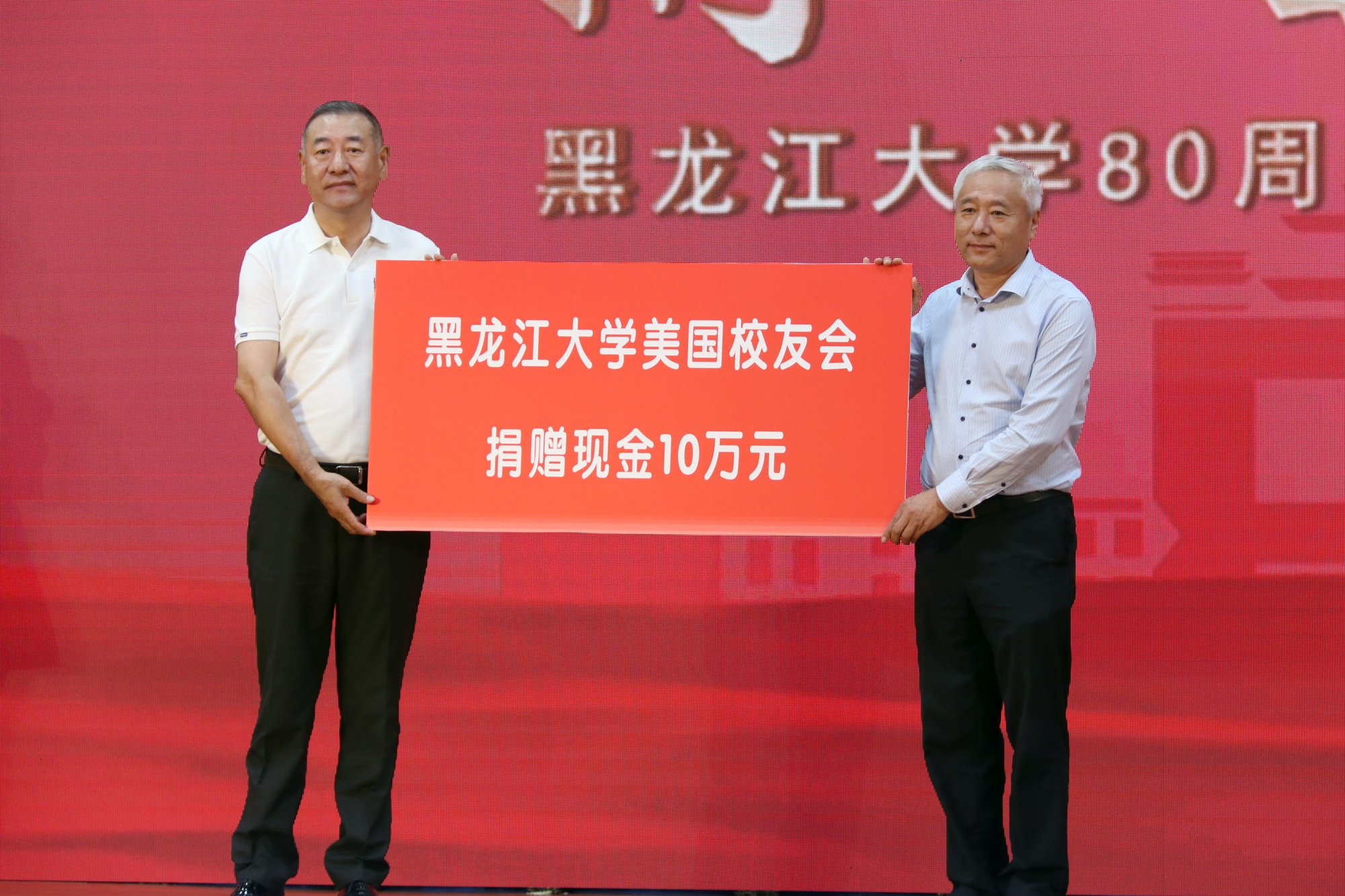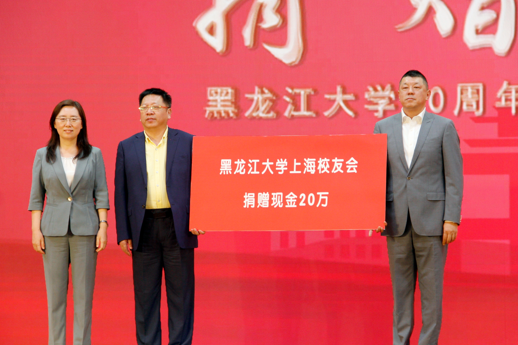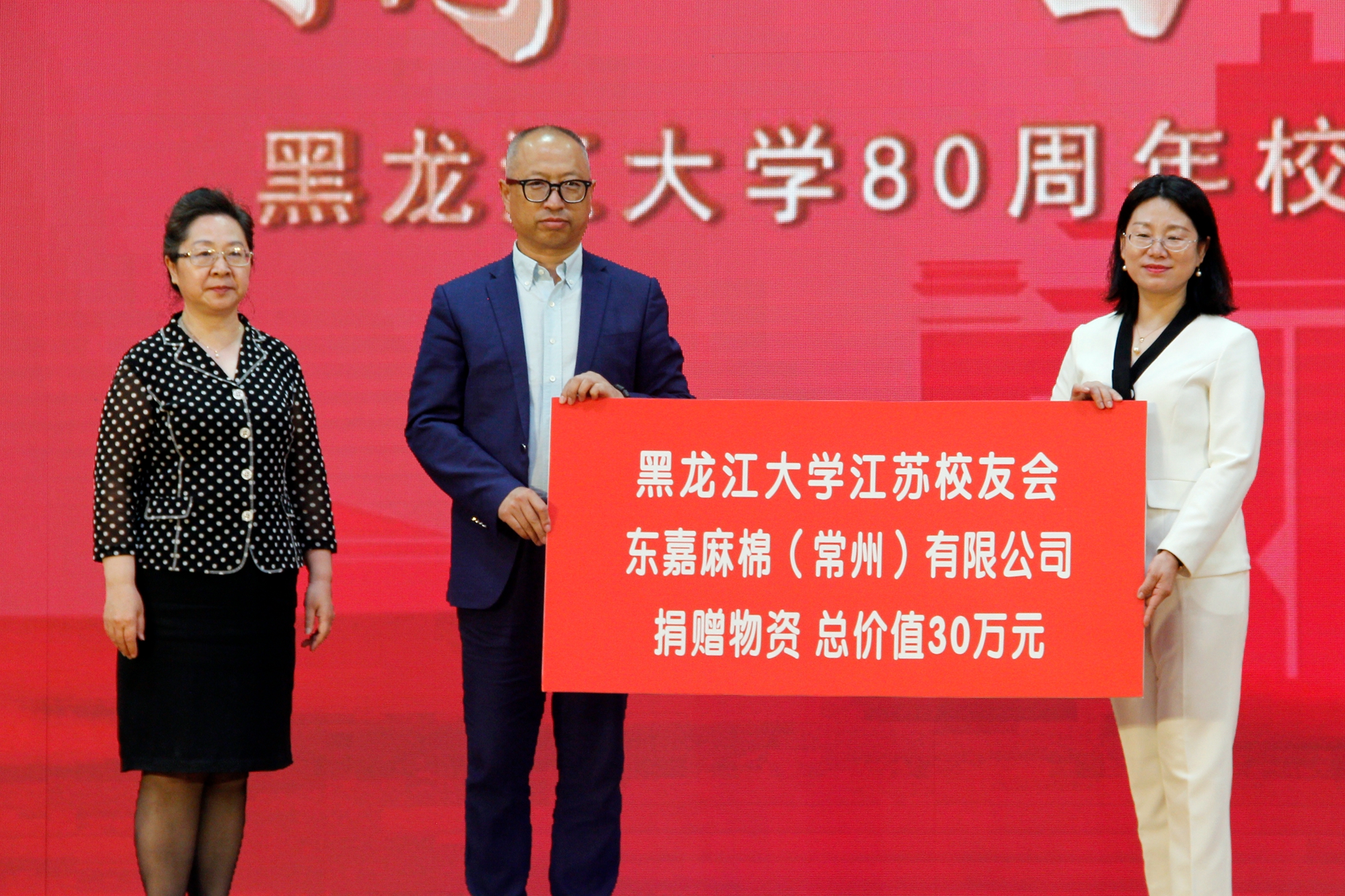 在校友捐赠仪式上,美国校友会副会长游晓航,上海校友会会长李永江和哈尔滨鹏程药用包装新材料科技股份有限公司副总经理任峰,江苏校友会会长郝秀凤和东嘉麻棉(常州)有限公司总经理邹志伟分别代表美国校友会、上海校友会、江苏校友会和校友企业东嘉麻棉(常州)有限公司捐赠人民币10万元、20万元和价值30万元的物资。