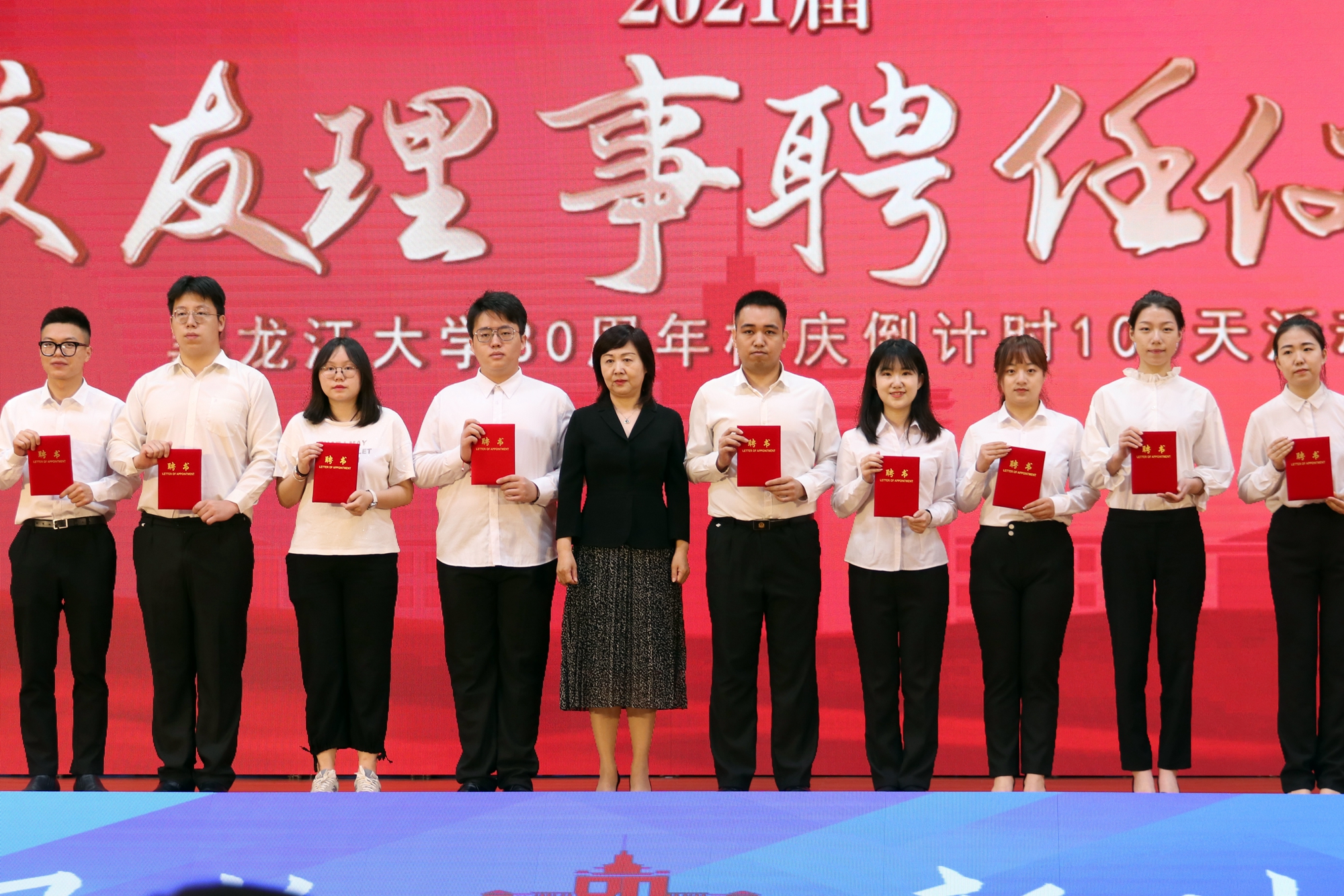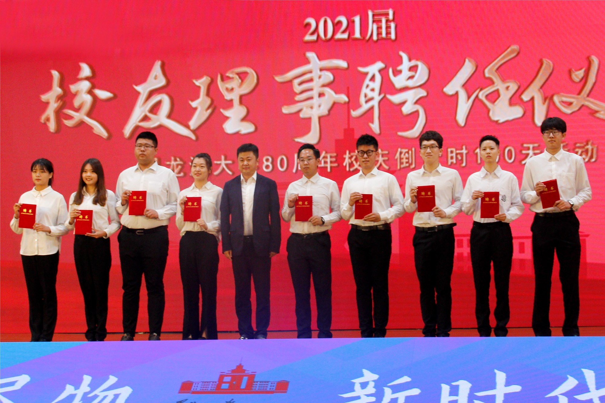 我校副校长李卓、钟卫东、于文秀依次为全校各学院2021届校友工作年级理事会理事长代表颁发聘书。