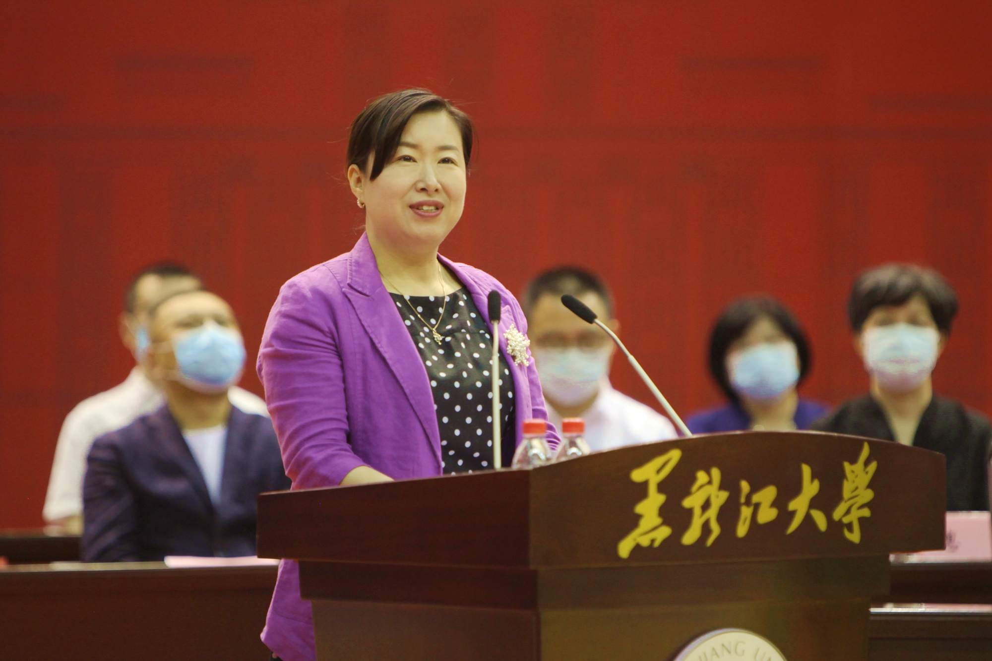 教师代表、黑龙江省教学名师、俄语学院党委书记黄东晶教授以向同学们表达衷心的祝愿,希望同学们在未来的新生活中不失落、不迷茫、不焦虑、不失望,心中有热血、眼中有阳光,拥有五彩的人生。