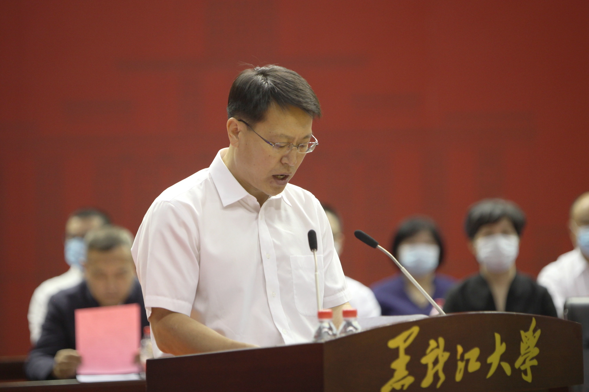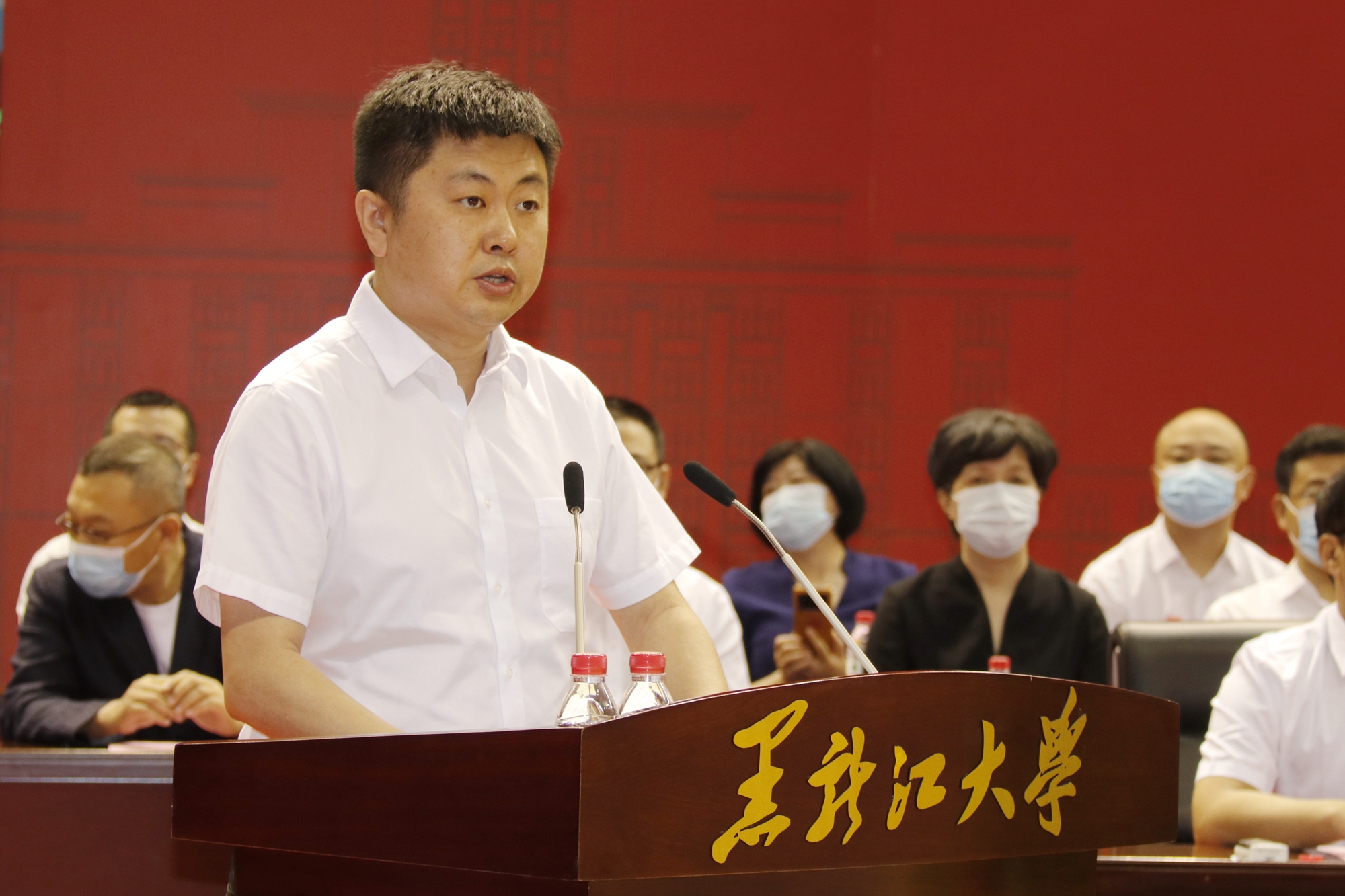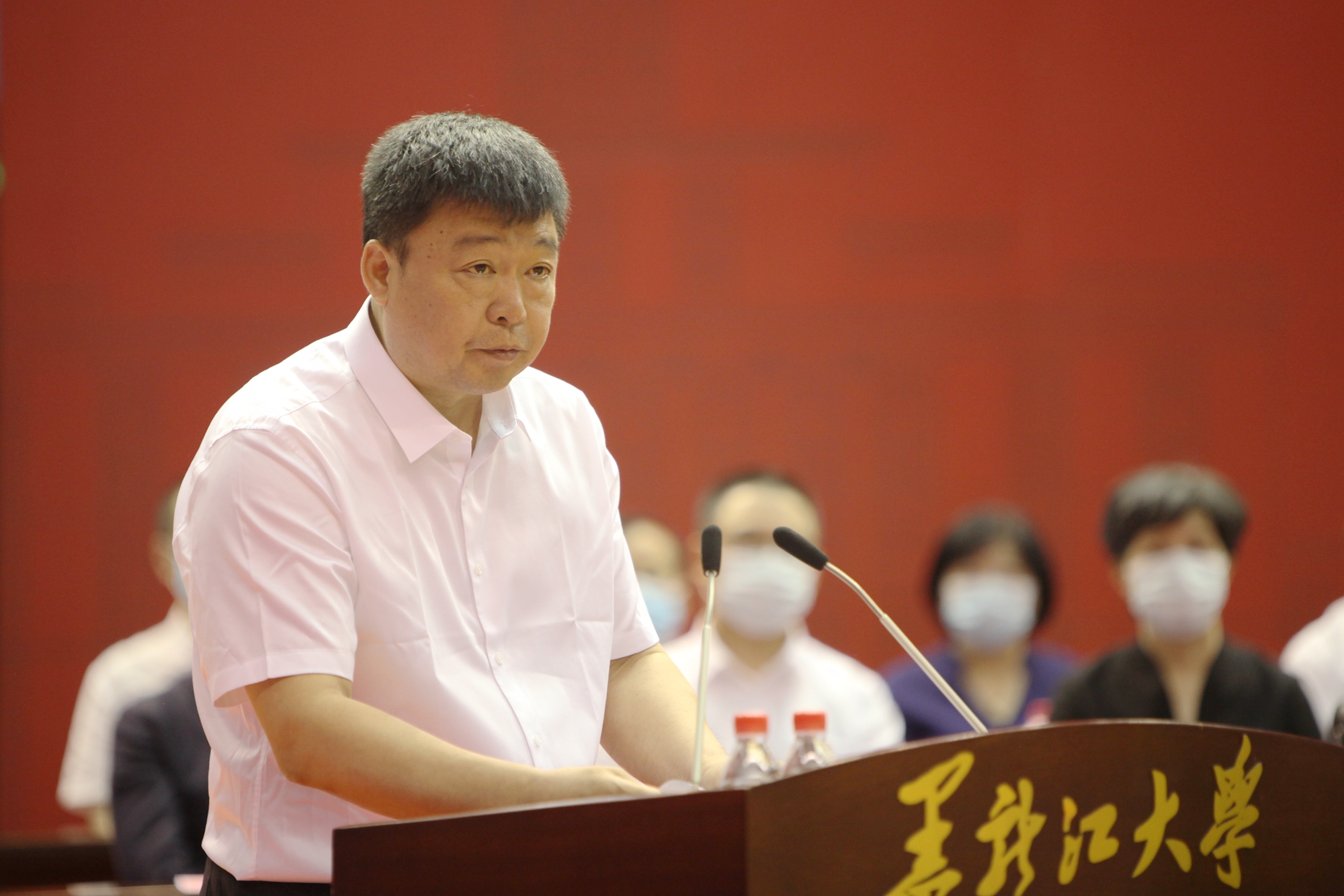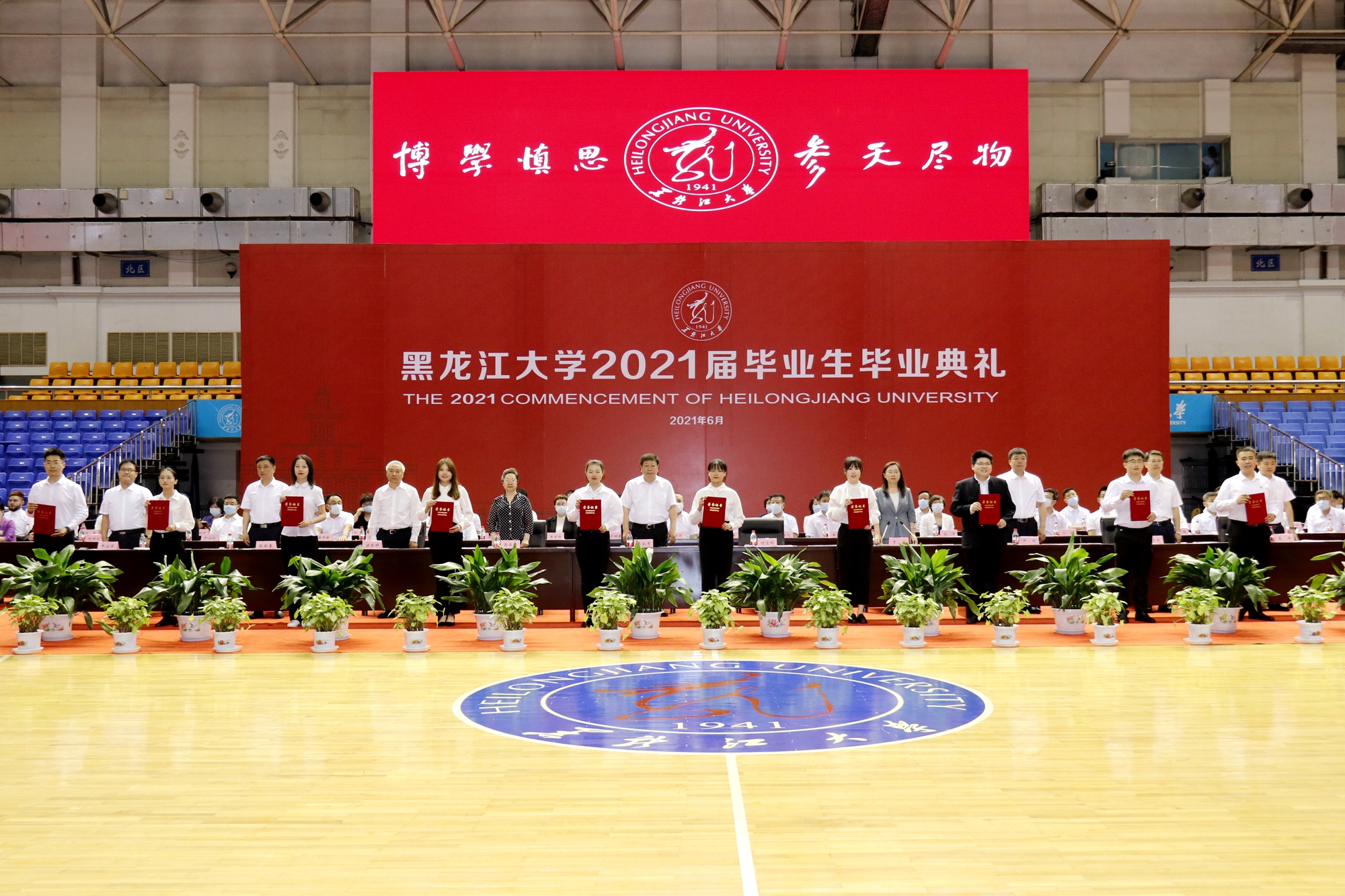 校长付宏刚发表讲话。他向即将毕业的6170名本科生、1877名研究生送上最真诚的祝福和最美好的祝愿,向所有帮助同学成长成才的师长、亲友表示诚挚敬意和衷心感谢。他深情回顾了过去的四年,2021届黑大学子走过属于自己的“小时代”,见证祖国发展的“大时代”的历程,并真诚地为同学们提出三点希望:一是希望大家常怀感恩之心,秉持家国情怀。希望同学们无论何时何地都要传承“黑大人”流淌不息、代代相传的精神血脉,保持热情和善良,感恩祖国和社会、感恩家庭和他人,自觉担负起当代青年的时代使命和社会责任,将感恩之心化为爱国之情、报国之志,练就敢担大任的勇气,争做走在时代前列的奋进者、开拓者、奉献者。二是希望大家务实笃行,练就真本事。希望同学们传承以俄语词典编译团队为代表的“黑大人”的意志品格,树立终身学习理念,持之以恒求真学问、练真本事,不断汲取知识力量,不断提升掌握和运用知识的能力,脚踏实地、立足本职、埋头苦干,敢于创新,追求卓越、寻求突破,淬炼过硬本领,靠真本事立足、立业、立家。三是希望大家涵养人生智慧,乐观豁达。希望同学们心中有阳光,脚下有力量,以“士不可以不弘毅”的坚毅品格和持久定力,始终坚守初心,传承黑大精神,秉承黑大校风,与祖国同心、与时代同行,坚持理想不懈怠,珍惜韶华担使命,用情怀、本领和智慧擦亮“黑大人”这个无上光荣的称号,向时代、向祖国、向母校交出优秀答卷!