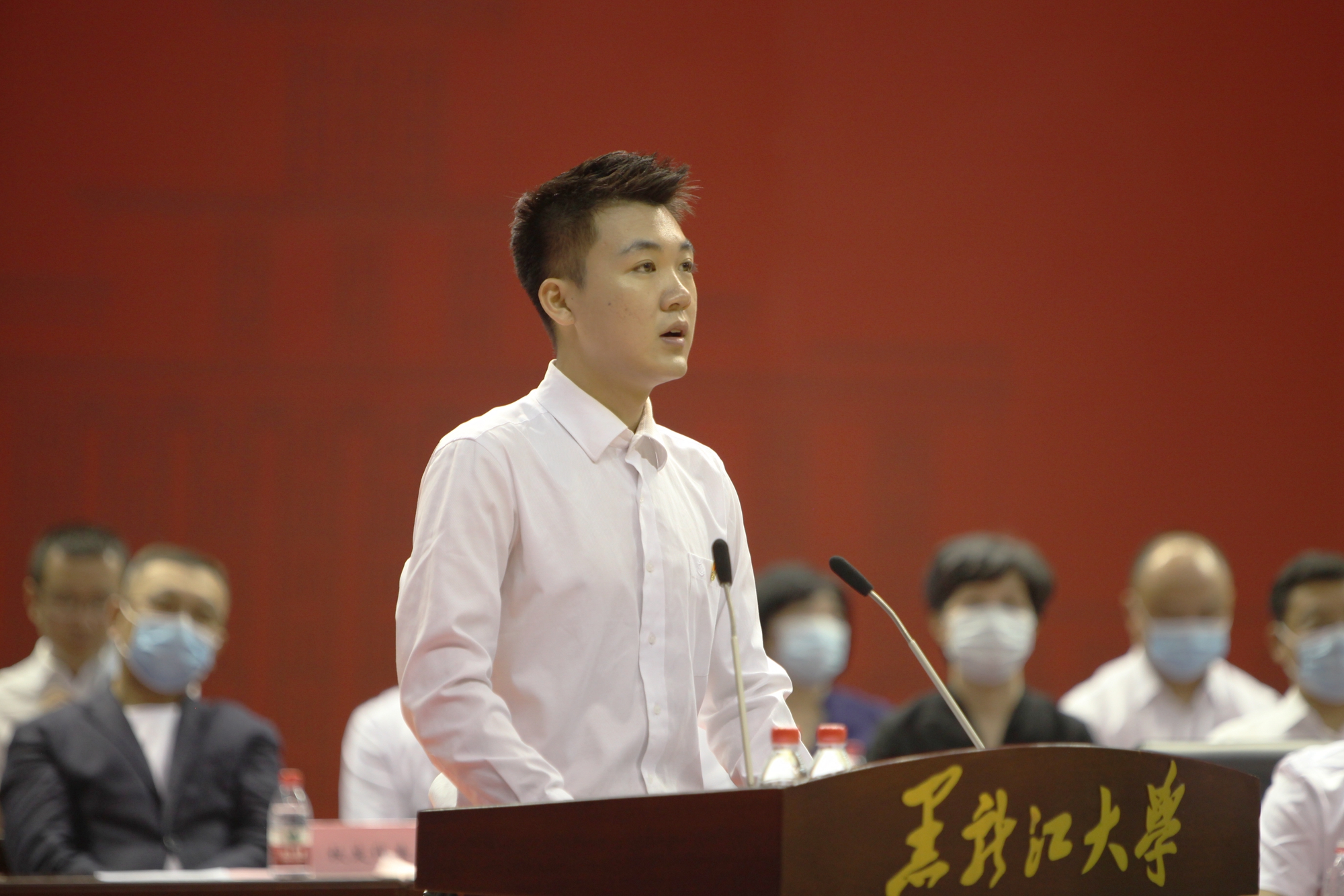 毕业生代表、经济与工商管理学院崔向程代表全体毕业生,向母校和全体老师的悉心培育致以崇高的敬意,向父母的默默支持表示衷心的感谢,向几年来朝夕相处的兄弟姐妹送上真挚的祝福。在即将与黑大话别的时刻,他深情回顾了美好大学时光中的收获与成长,表示无论何时何地,自己都是追梦筑梦、敢于担当的黑大青年,都将继续关心和参与母校的发展,衷心祝福母校蓬勃发展,各位师长、同窗诸事顺利。
