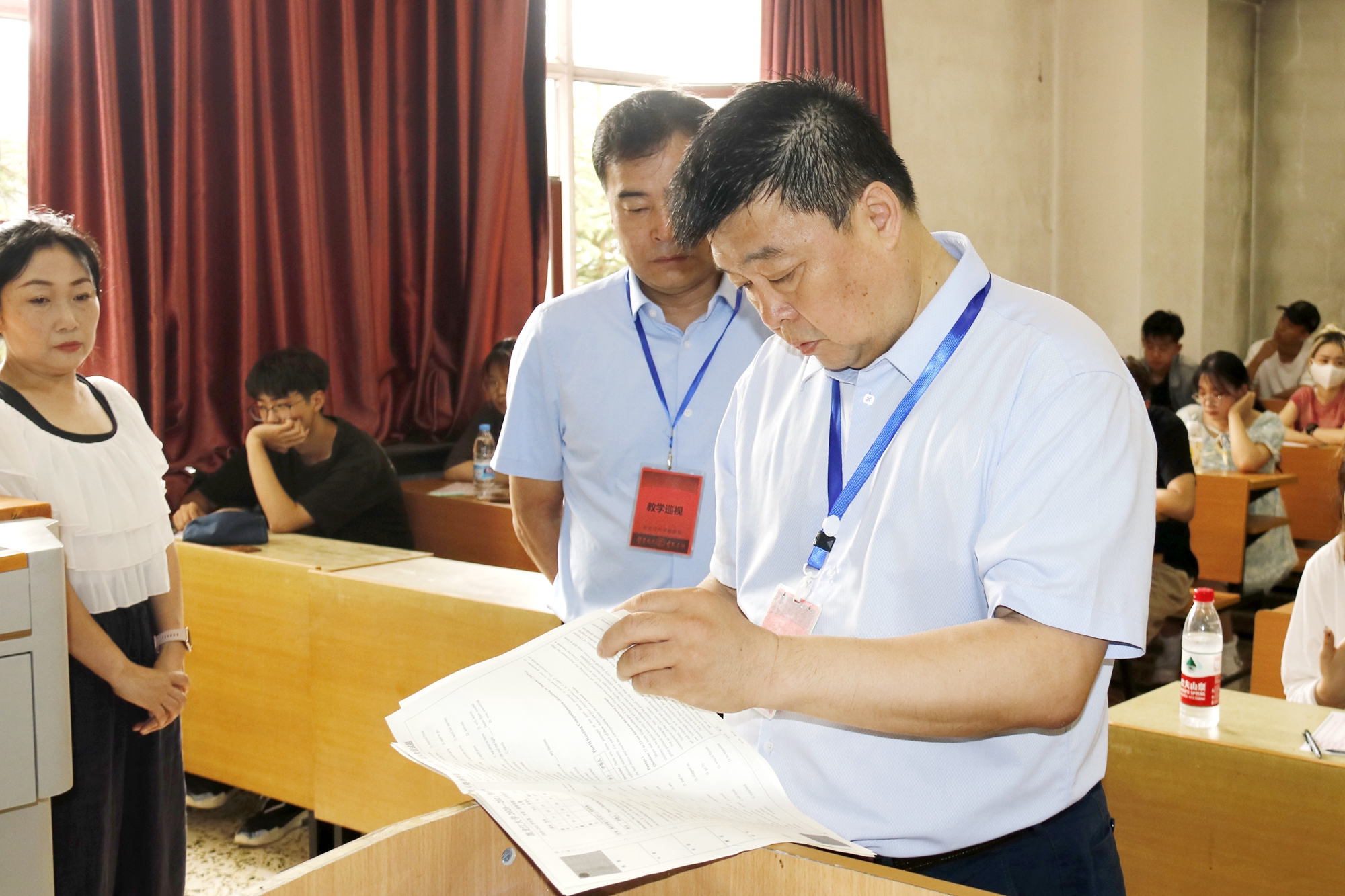 7月12日,我校2020-2021学年第二学期期末考试工作正式启动。上午8时,副校长严明,教务处、应用外语学院等考风考纪巡视组成员对汇文楼各考场展开巡视工作。