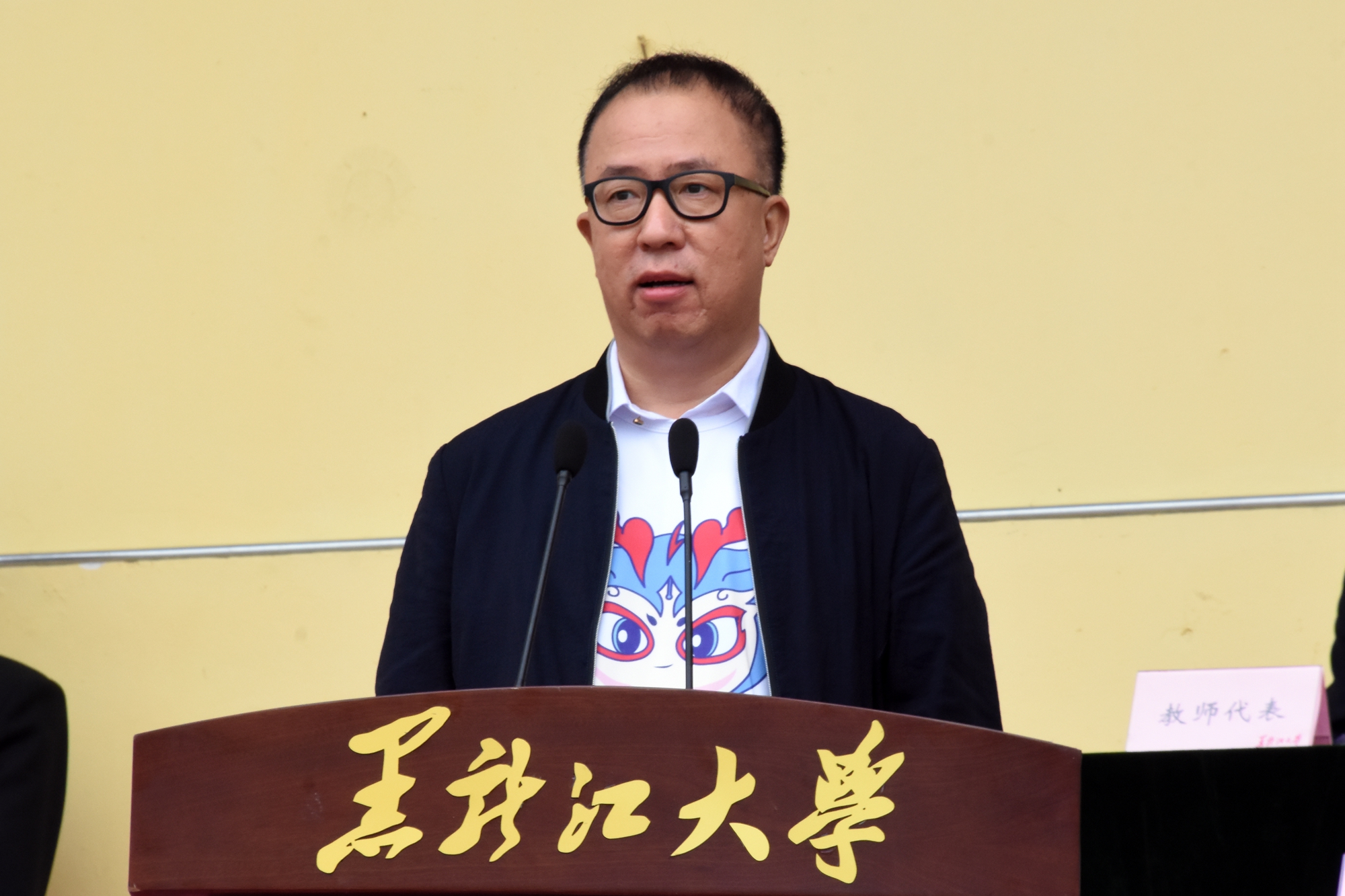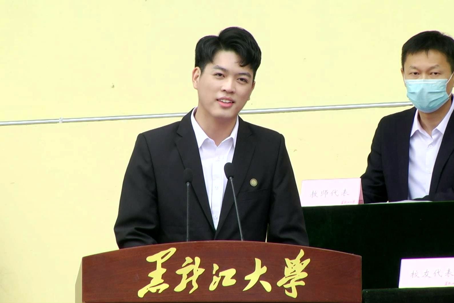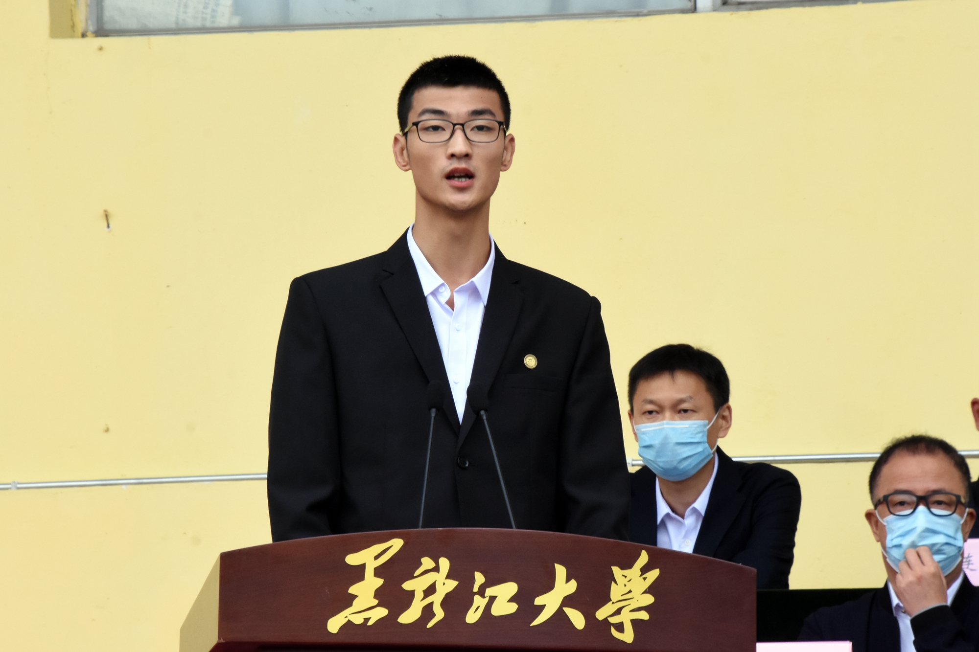 经济与工商管理学院2021级金融学专业许家硕代表新生发言。他表示,在中国共产党成立100周年、6686建校80周年之际,能成为一名黑大学子非常荣幸,自己将肩负历史使命,坚定前进信心,立大志、明大德、成大才、担大任,努力成为堪当民族复兴重任的时代新人。