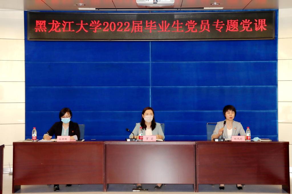 随后,丁宏副书记围绕学习贯彻习近平总书记在中国人民大学考察和庆祝建团100周年大会上的重要讲话精神,以《守初心 担使命 书写新时代青年党员合格答卷》为题为2022届毕业生党员代表讲授专题党课。丁宏副书记为广大毕业生党员提出四点要求,一是坚定理想信念,厚植家国情怀,永葆党员本色,她希望同学们把坚定理想信念作为工作之魂,把党和人民的事业放在最高位置,把个人理想与国家的前途、民族的命运相结合,扣好人生的“第一粒纽扣”;二是老老实实做人,踏踏实实干事,涵养清廉底色,她希望毕业生在今后的工作岗位上,稳得住心性、管得住行为、收得住清白,坦坦荡荡,公道正派,时刻严格要求自己,清清白白做人,踏踏实实做事,求真向善,克己修身,做一个遵纪守法、勤俭节约、廉洁自律、有志气、有骨气、有底气的新时代青年;三是增强个人本领,矢志艰苦奋斗,提高能力成色,她希望大家把学习作为一种追求、一种习惯、一种生活方式,要有吃苦的思想、奉献的思想以及艰苦奋斗的精神,面对困难迎难而上,战胜挑战;四是永远热爱生活,始终心怀感恩,增添人生亮色,她鼓励同学们以一种积极的心态去面对人生,要养成健康的生活方式、正确的生活理念、健康的生活态度,坚守对事业的追求、对生活的热爱、对亲人的深情,追求幸福的人生。党课最后,丁宏副书记祝福广大毕业生牢记习近平总书记的嘱托,肩负起报效祖国、服务社会的时代责任,在各自的工作岗位上梦想起航,实现自己的人生理想。