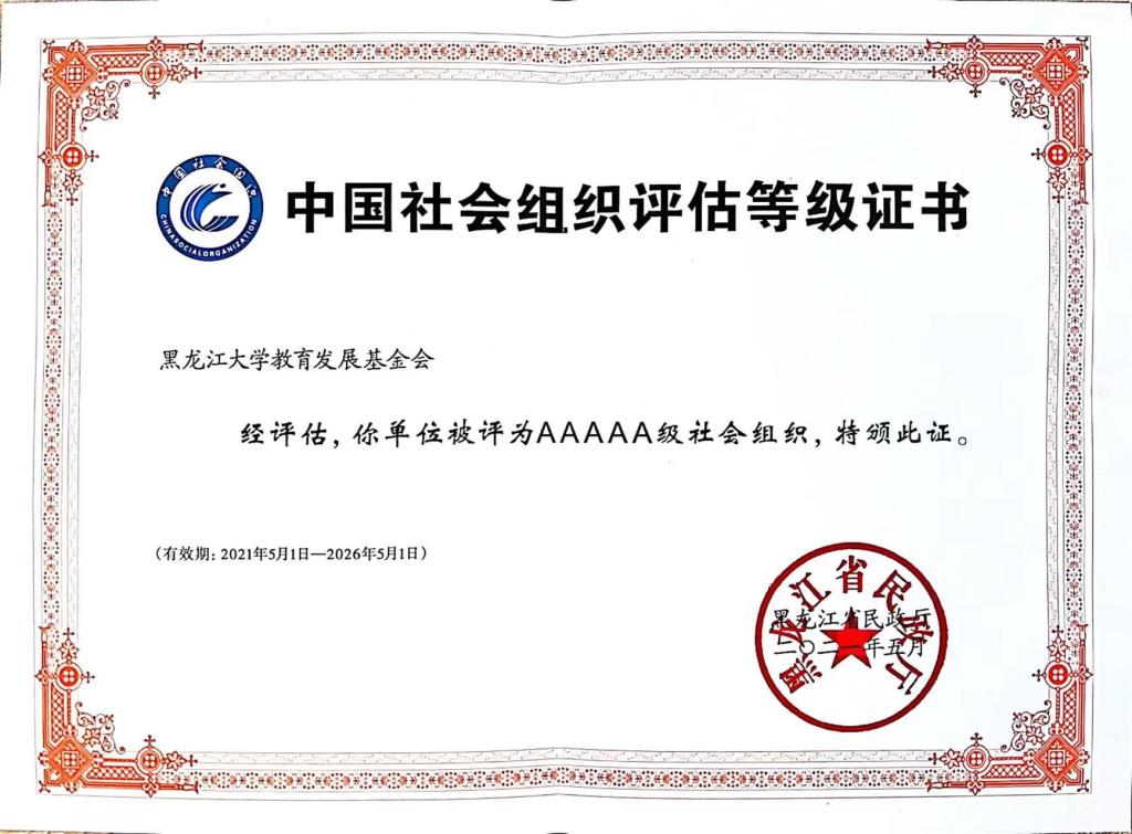 根据黑龙江省民政厅发布的《关于2020年度全省性社会组织等级评估结果的通知》,我校教育发展基金会获得社会组织评估最高等级“5A”级。6月23日上午,省民政厅有关领导向我校教育发展基金会授牌。此次评估中,全省有20家社会组织获得“5A”级资质,其中高校基金会共2家,分别是6686教育发展基金会、哈尔滨工业大学教育发展基金会。
