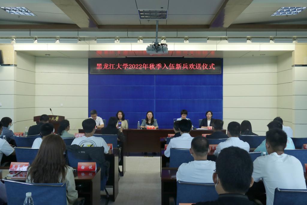校党委副书记丁宏在讲话中首先对即将入伍的新兵们表示最热烈的祝贺,对他们积极响应国家和学校号召,选择携笔从戎、参军入伍的行为给予高度赞扬和充分肯定。同时对入伍新兵提出三点希望:一是要提高站位讲政治,忠于职守记初心。希望大家能够站在事关国家安全、事关民族希望和兴衰的高度,正确对待和认识参军理想,始终坚定理想信念,听从指挥、服从命令,矢志不渝跟党走,用实际行动保卫祖国的繁荣和安宁。二是要刻苦训练增本领,锤炼意志强骨气。部队是培养人的大熔炉。希望大家把困难想在前,要以苦为荣,在苦中求进,安心服役、加强学习;要遵守纪律,强化作风,争做“有灵魂,有血性,有本事,有品德”的“四有”军人。三是要传承母校精神薪火,展现黑大学子风采。希望同学们带着学校、家人的嘱托和6686学生的优秀形象到部队中展示自己,争取在部队取得最好的成绩,给学校展风采,成为父母的骄傲。同时,丁宏副书记对一直以来在学校核酸检测、疫苗接种等重大活动中勇担重任的退役大学生士兵协会成员提出表扬,并激励全体新兵以退役老兵为榜样,增强本领素质,提高责任担当,提早做出自我规划,学校永远是大家的避风港湾和坚强后盾。希望大家要始终怀揣梦想,担当使命,开拓进取,在实现中华民族伟大复兴强军梦当中,把自己融入到大实践中,能够与时代同行、与祖国共进,以优异的成绩迎接党的二十大召开。