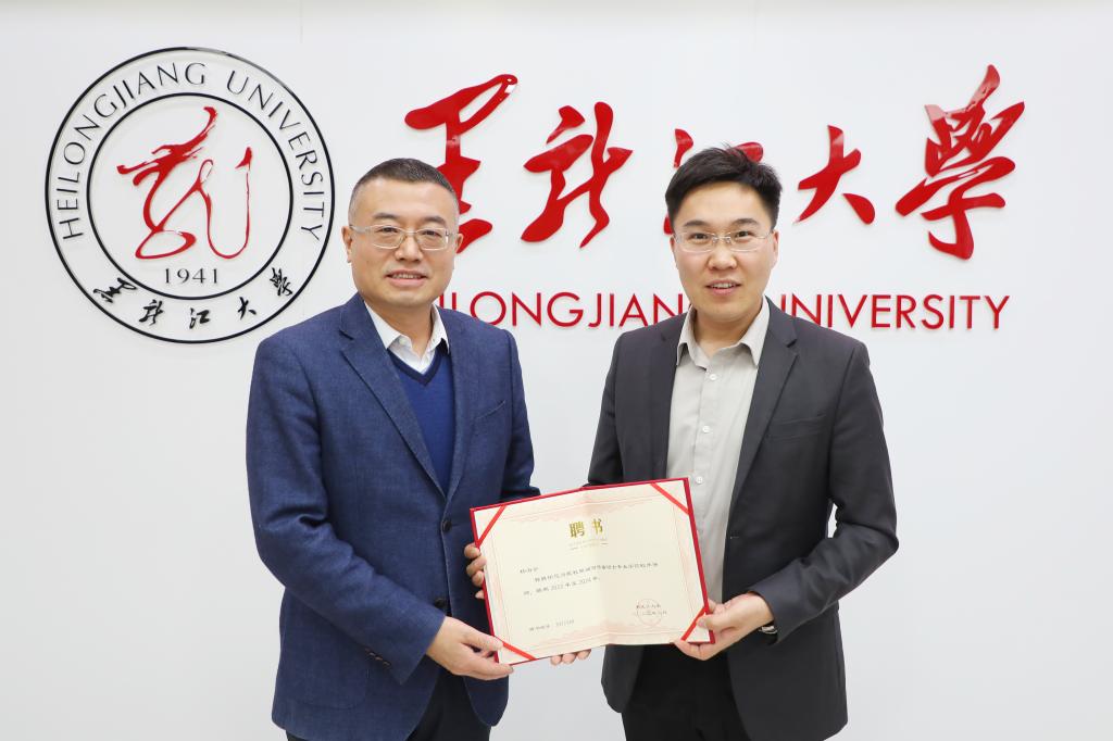 研究生院院长罗跃军为杨海全、陈默颁发专业学位校外导师聘书。